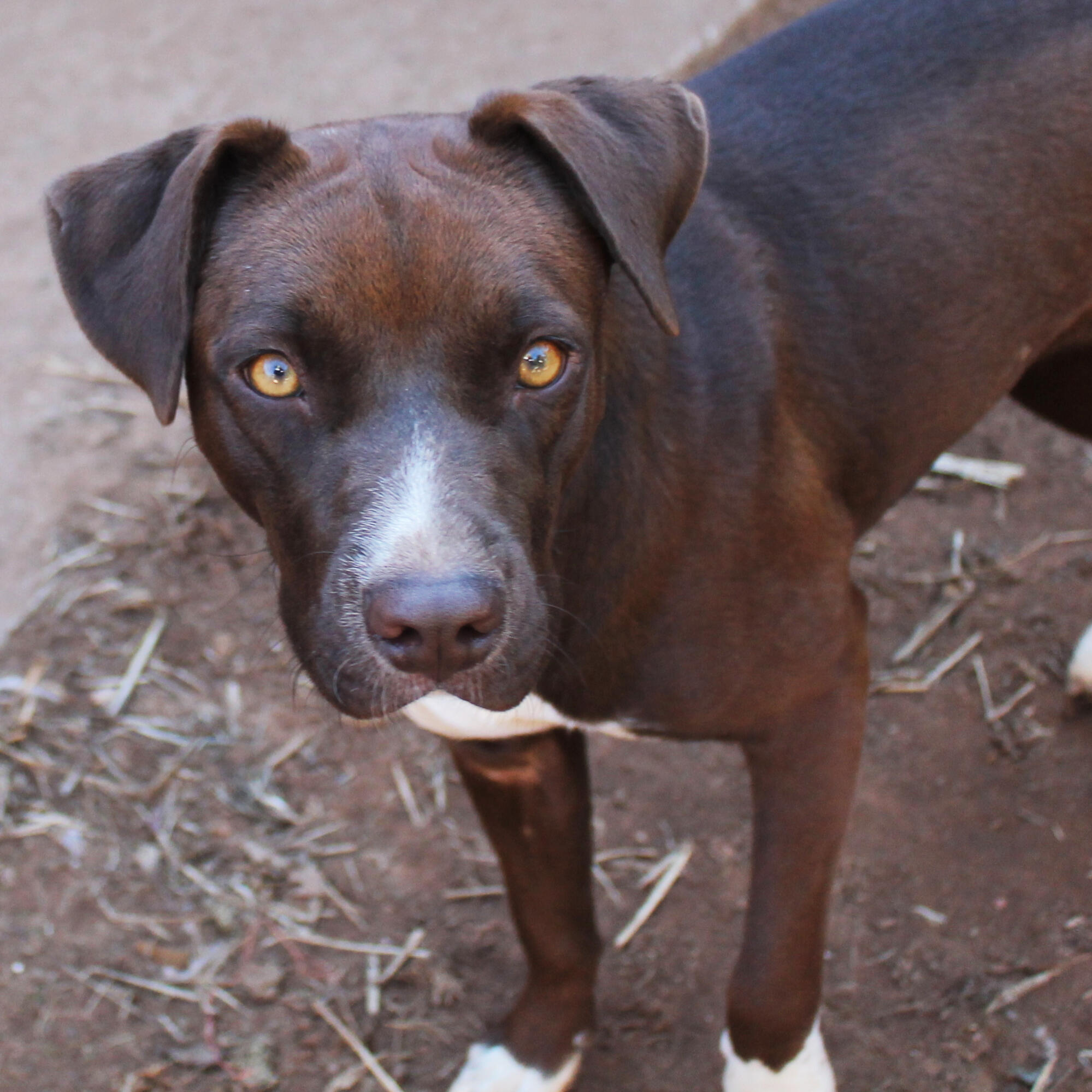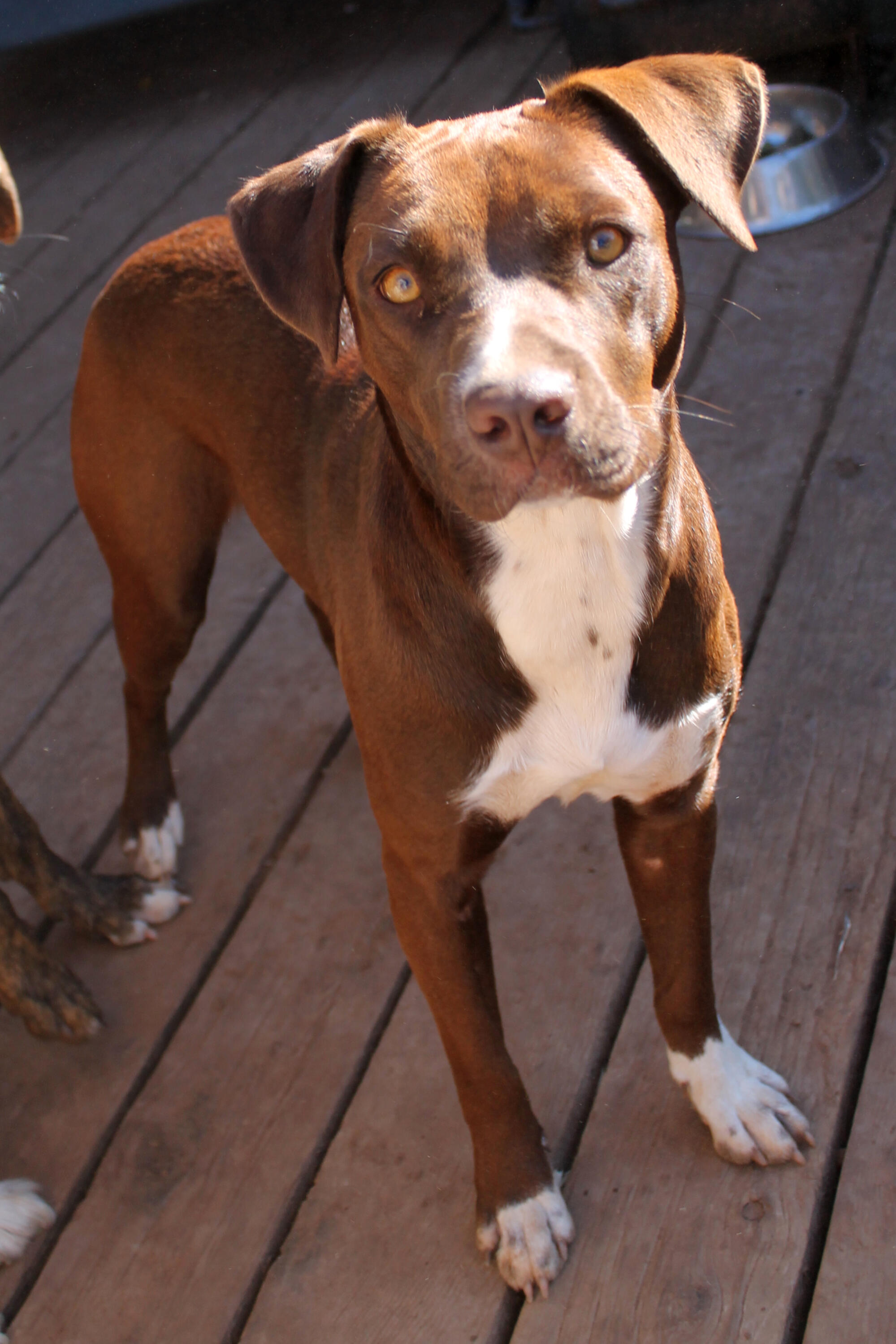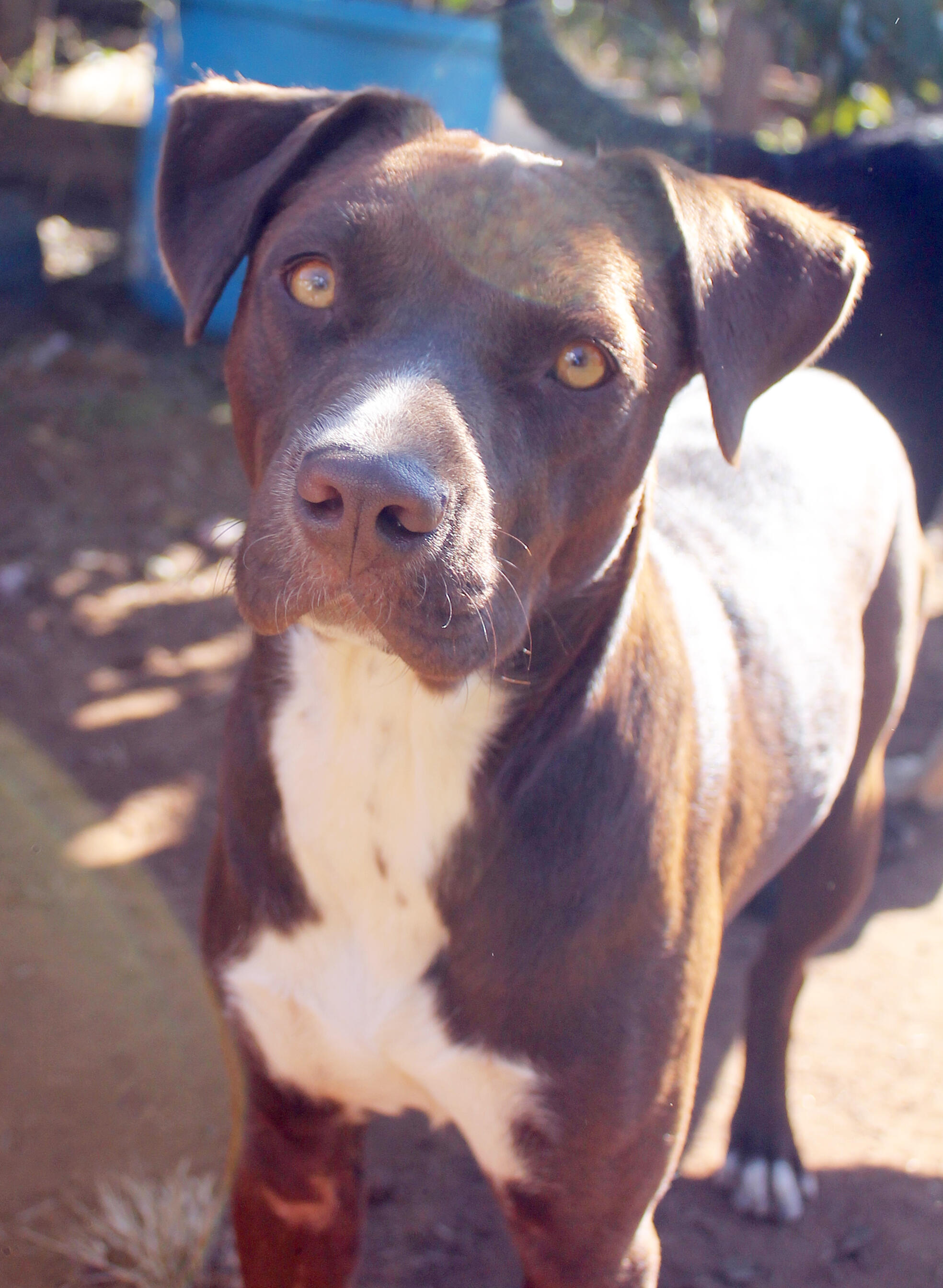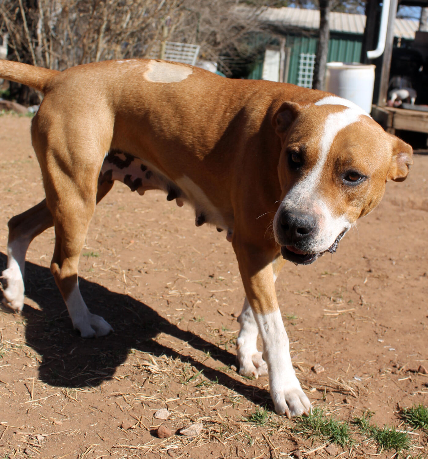 Toto came to the rescue after her puppies were taken from her much too early, and sold on craigs list. Toto was distrustful at first, but has learned that humans bring nice food, and some gentle head pats.While she is still shy, and a little growly at first, Toto is very sweet once she trusts her humans. Other dogs and cats are A-OK, but kids aren't a good much for her at this time.