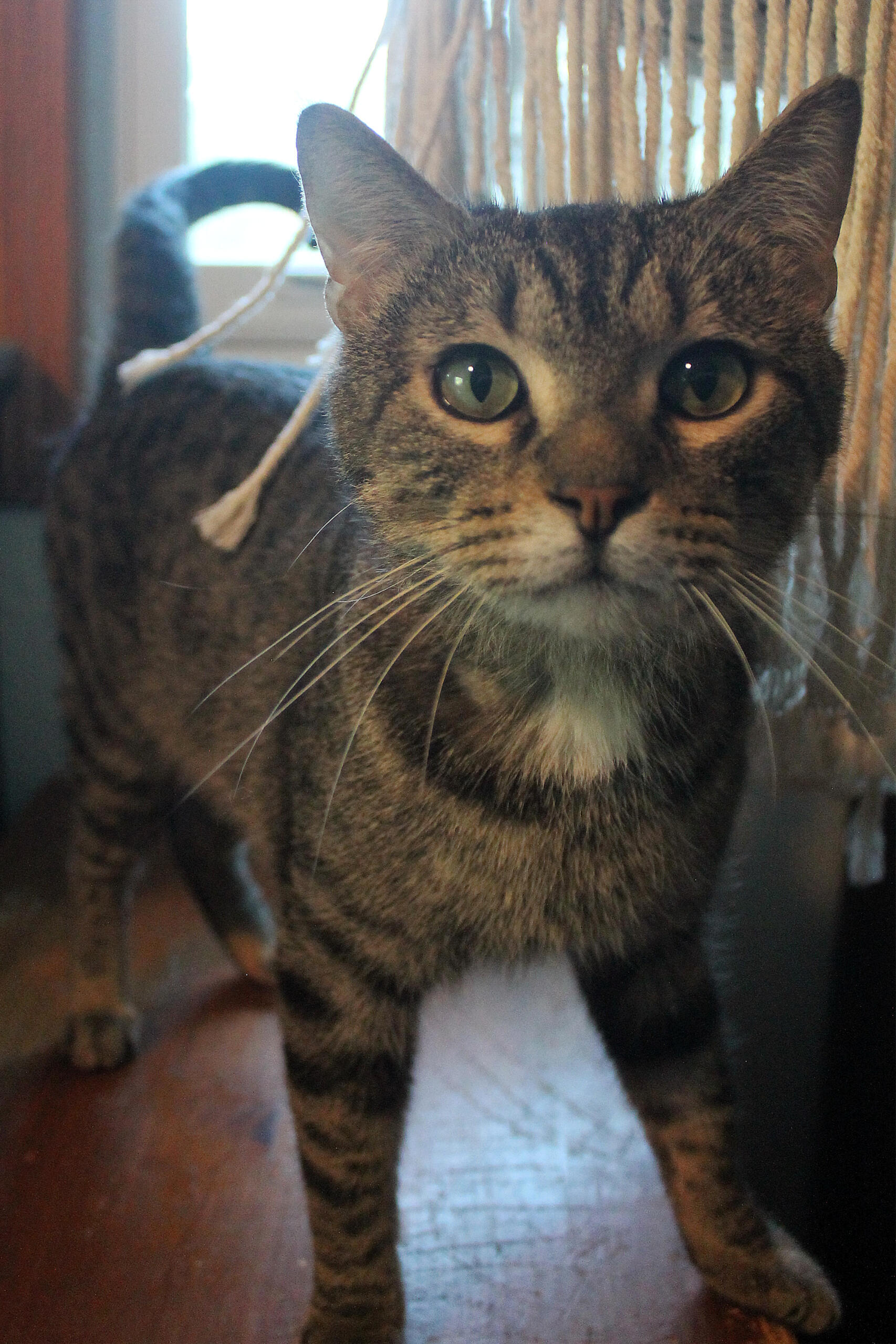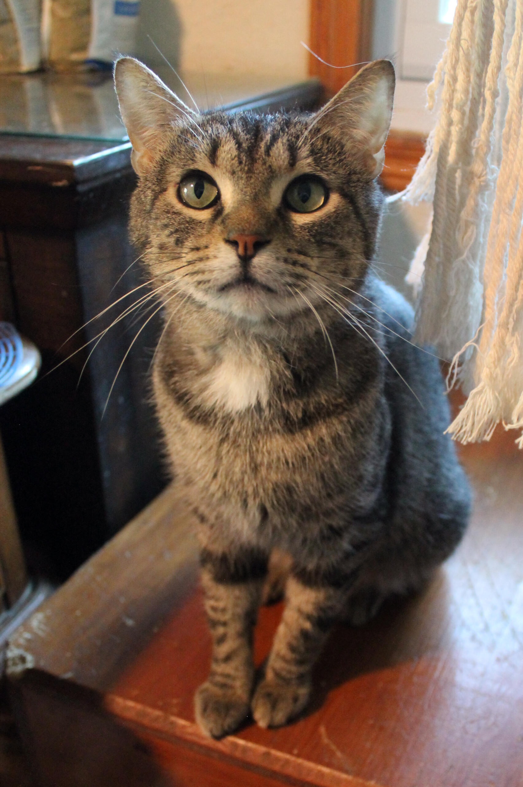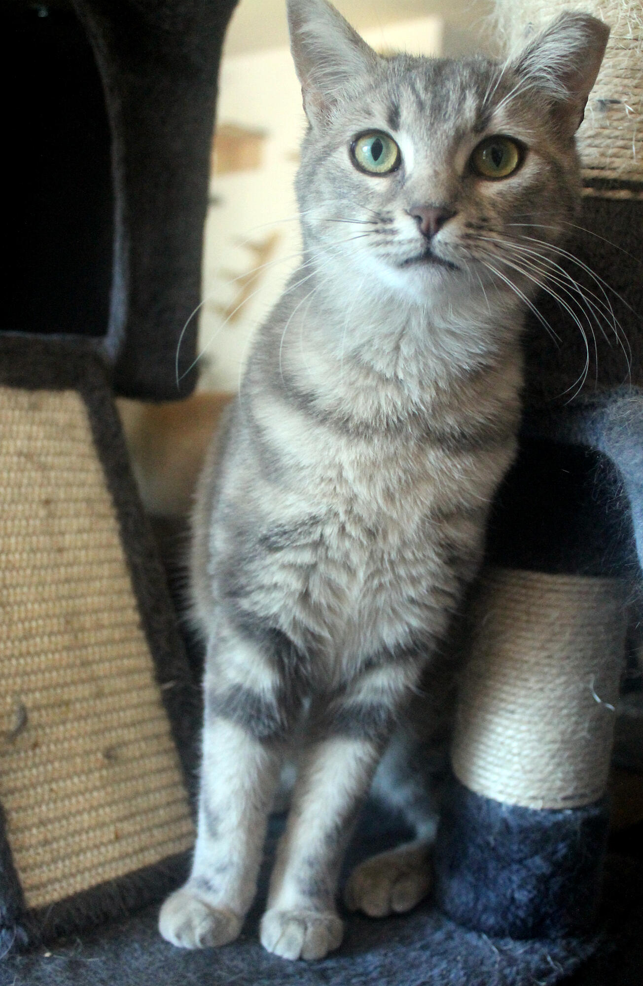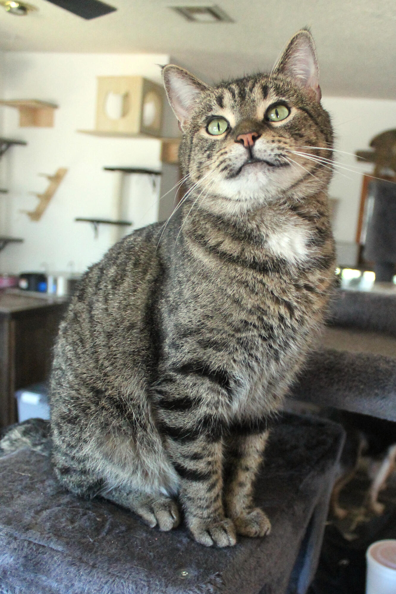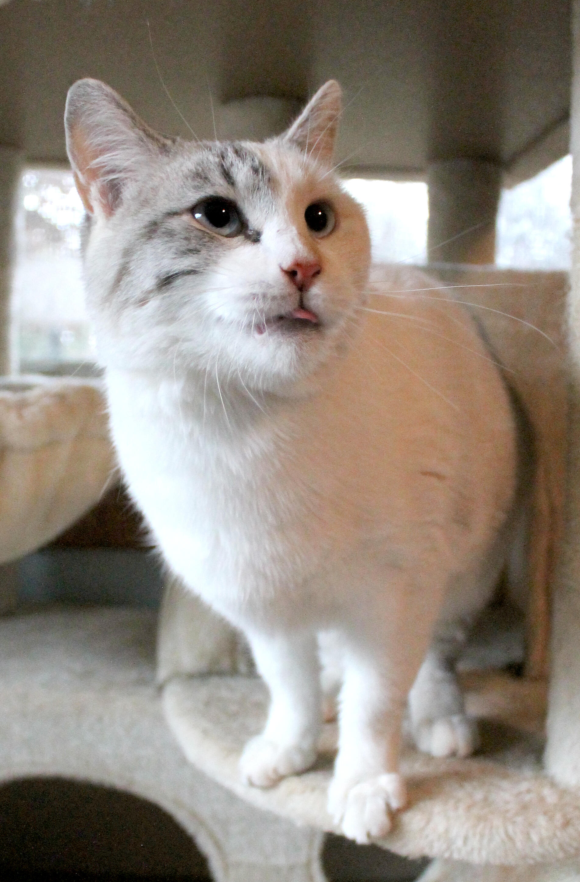 This sweet, easy going lady has eyes so crossed, one is pointed all the way in 😂 She might not be looking at you, but she IS paying attention! Googley Eyes is friendly, affectionate, and very gentle. She loves to cuddle humans, and enjoys the company of other cats. She is also a very large cat, rather than a tiny dainty girl 😅 She will happily be carried around, if you can lift her!