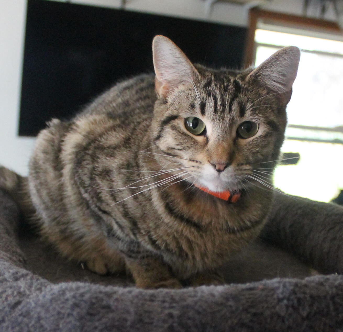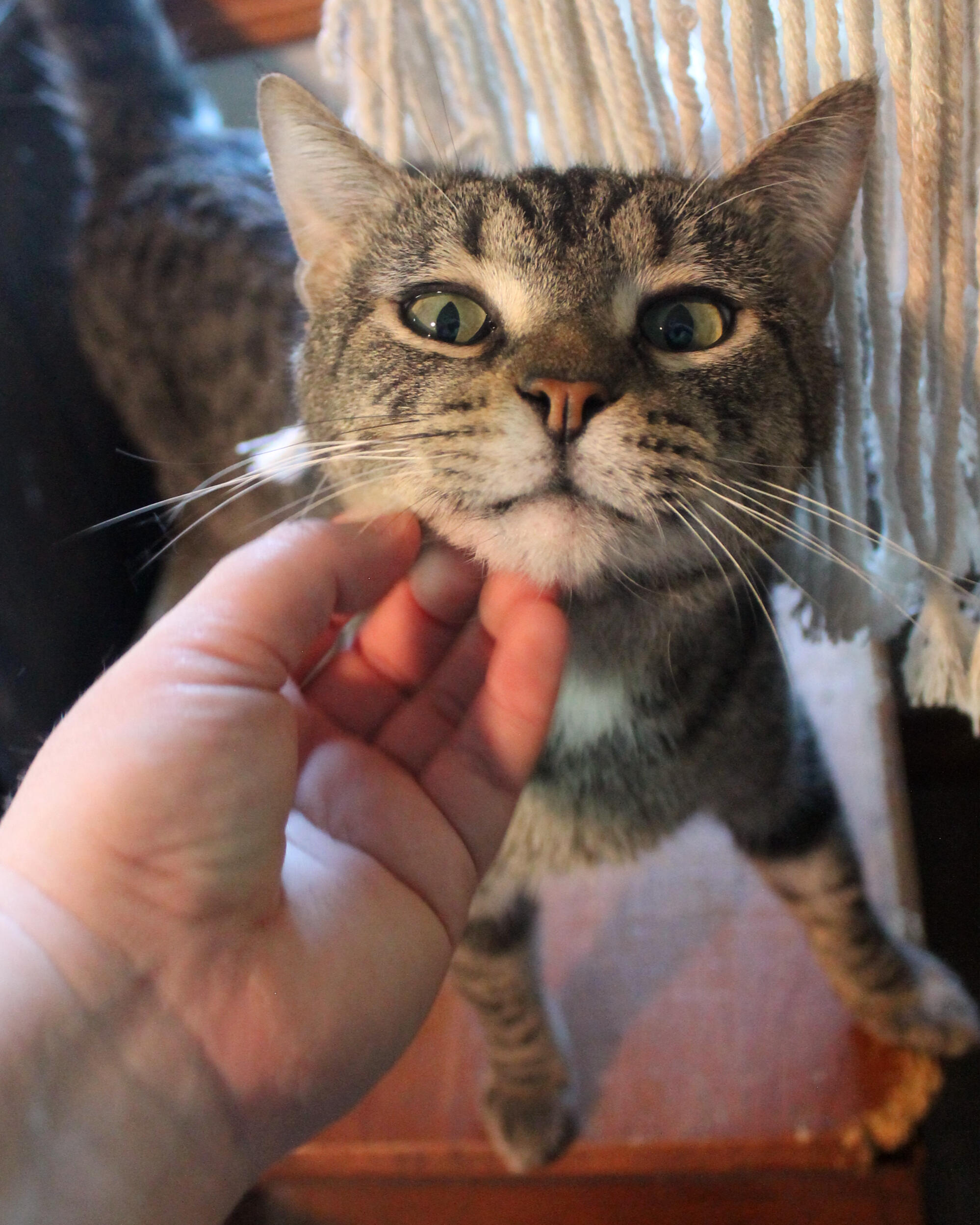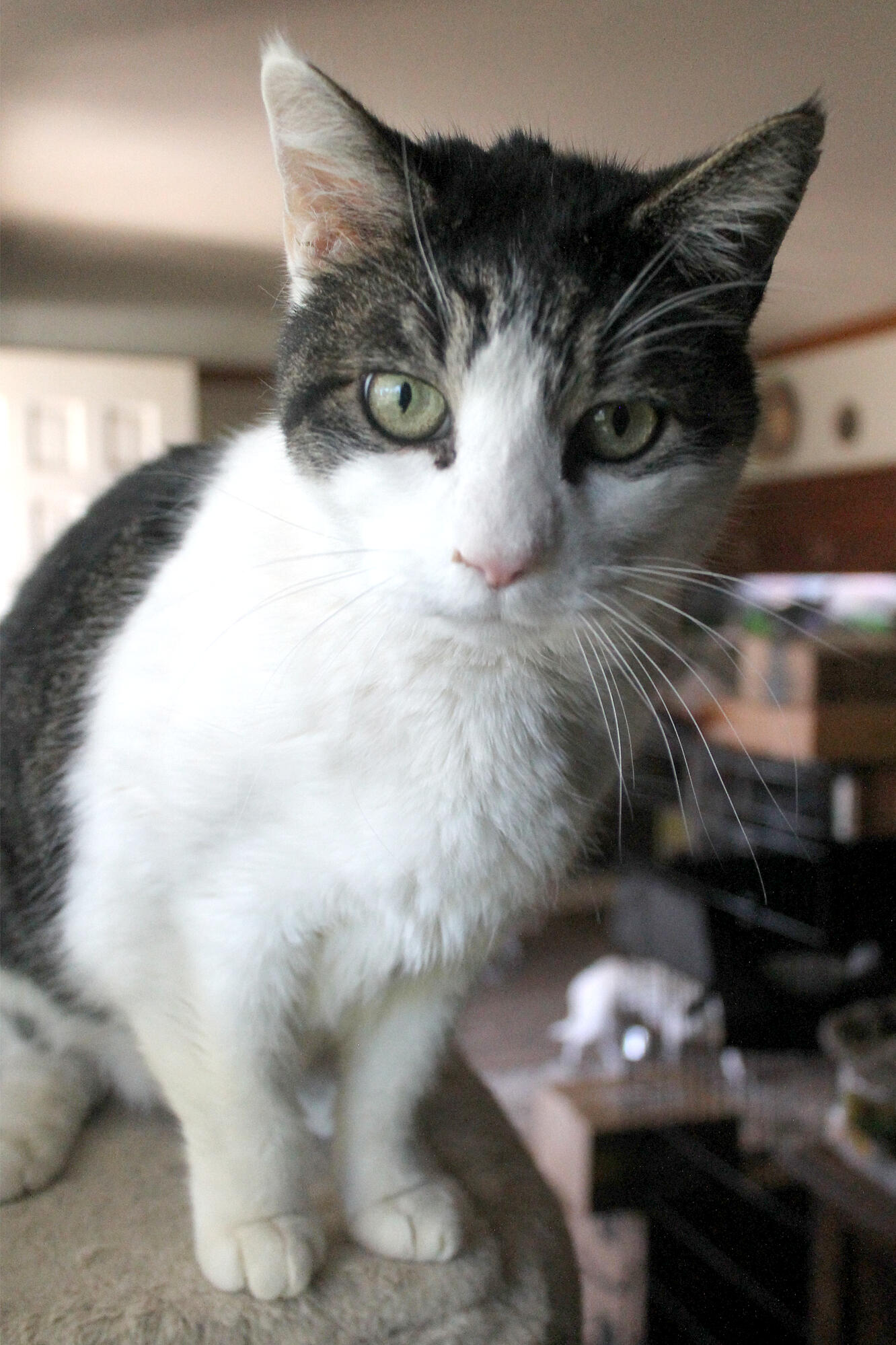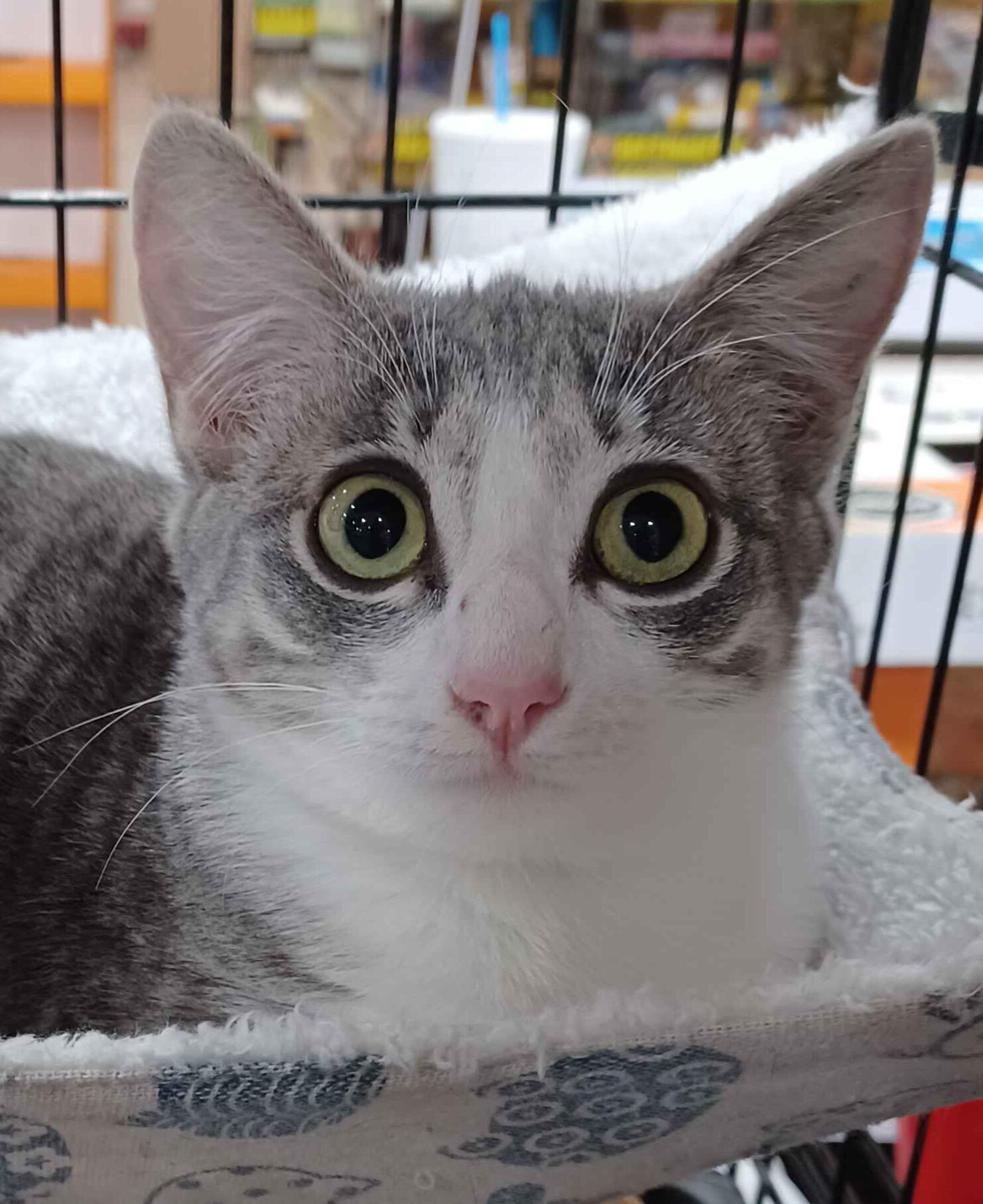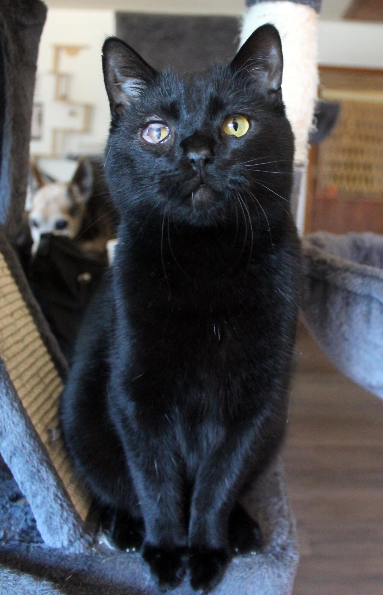 This sweet, easy going lady has eyes so crossed, one is pointed all the way in 😂 She might not be looking at you, but she IS paying attention! Googley Eyes is friendly, affectionate, and very gentle. She loves to cuddle humans, and enjoys the company of other cats. She is also a very large cat, rather than a tiny dainty girl 😅 She will happily be carried around, if you can lift her!