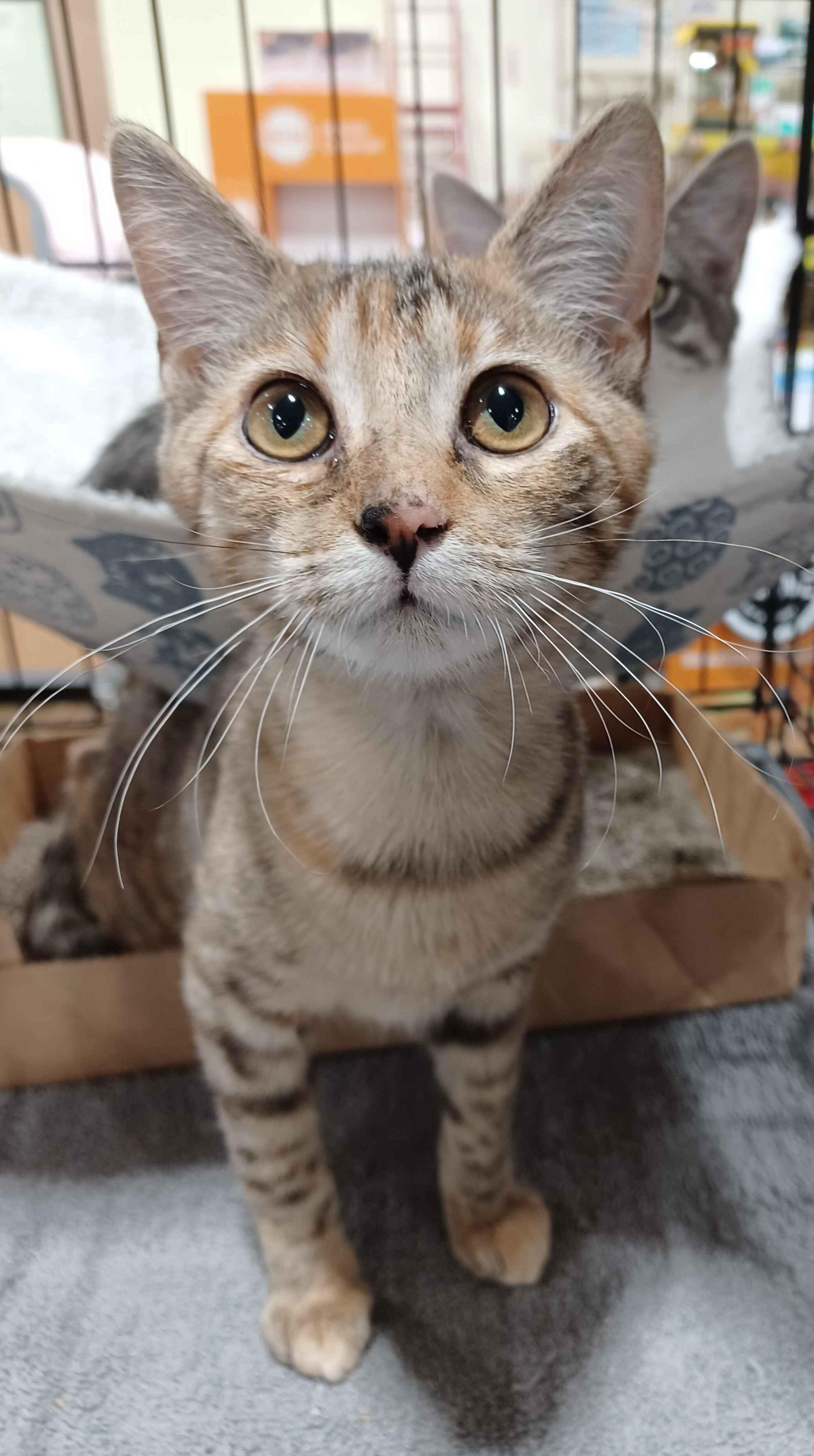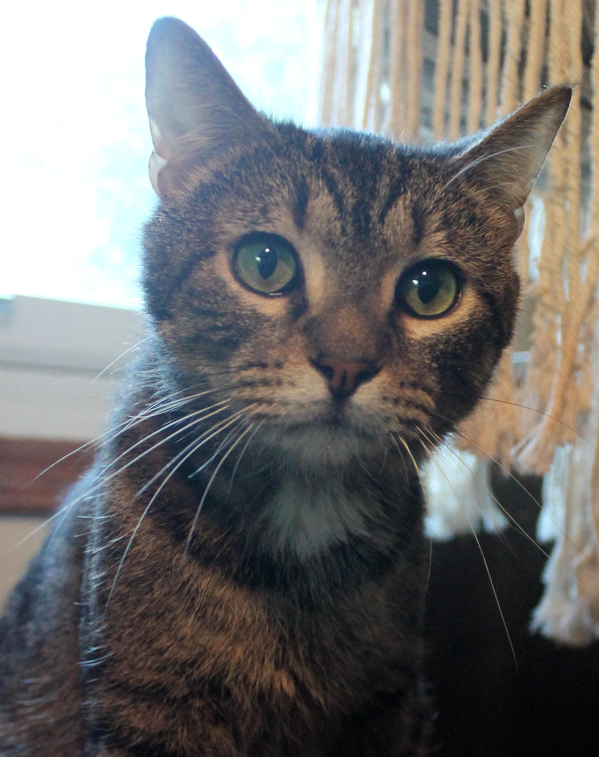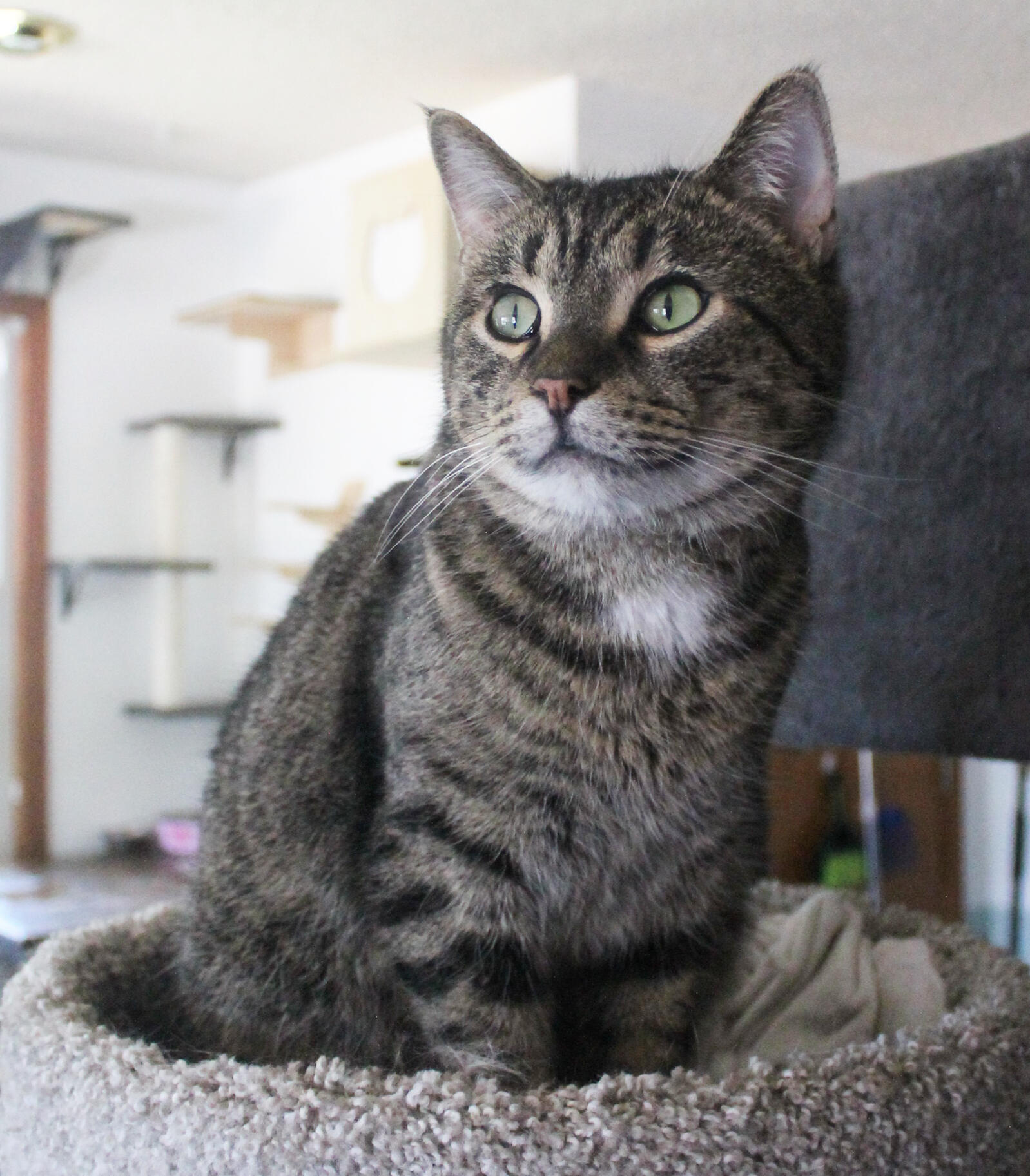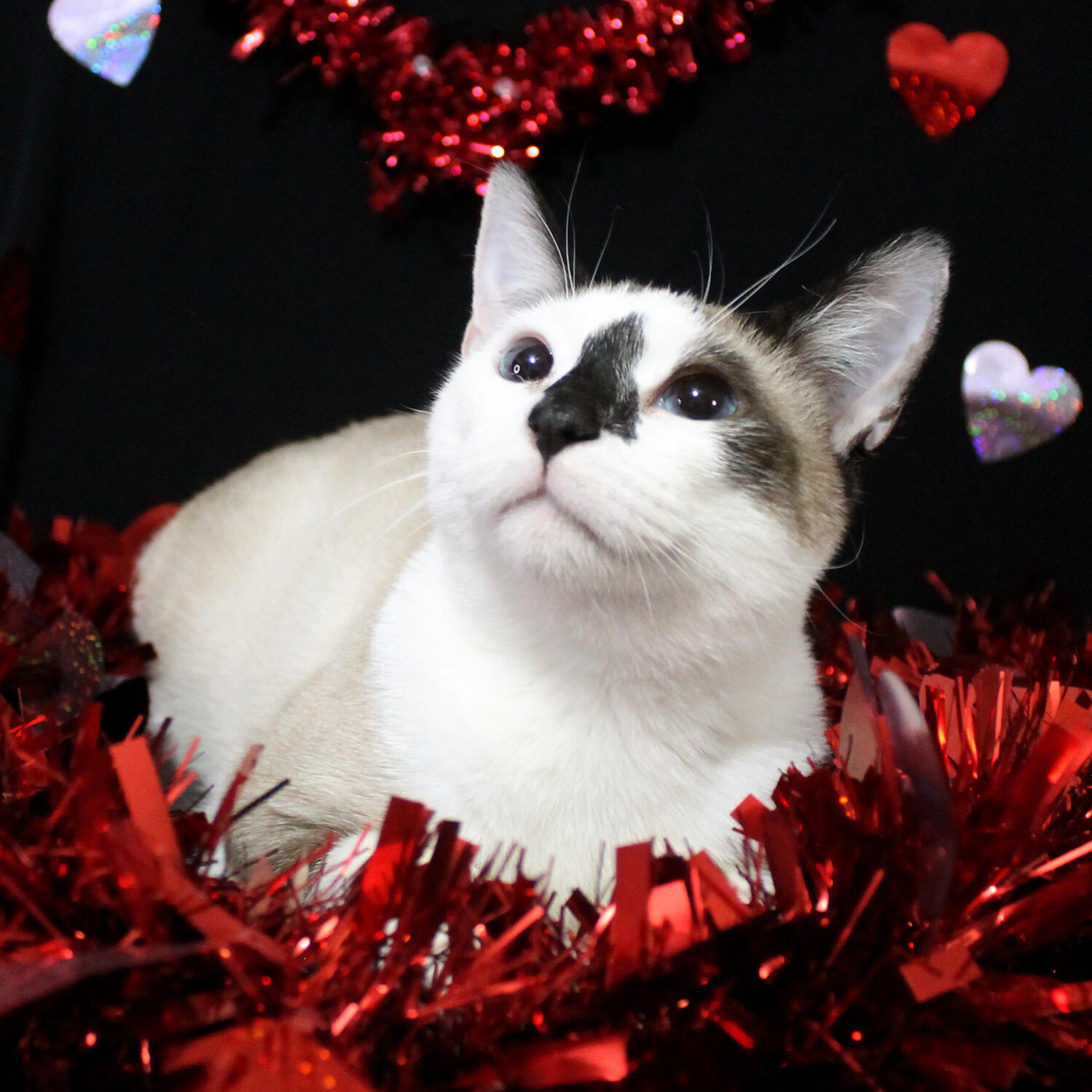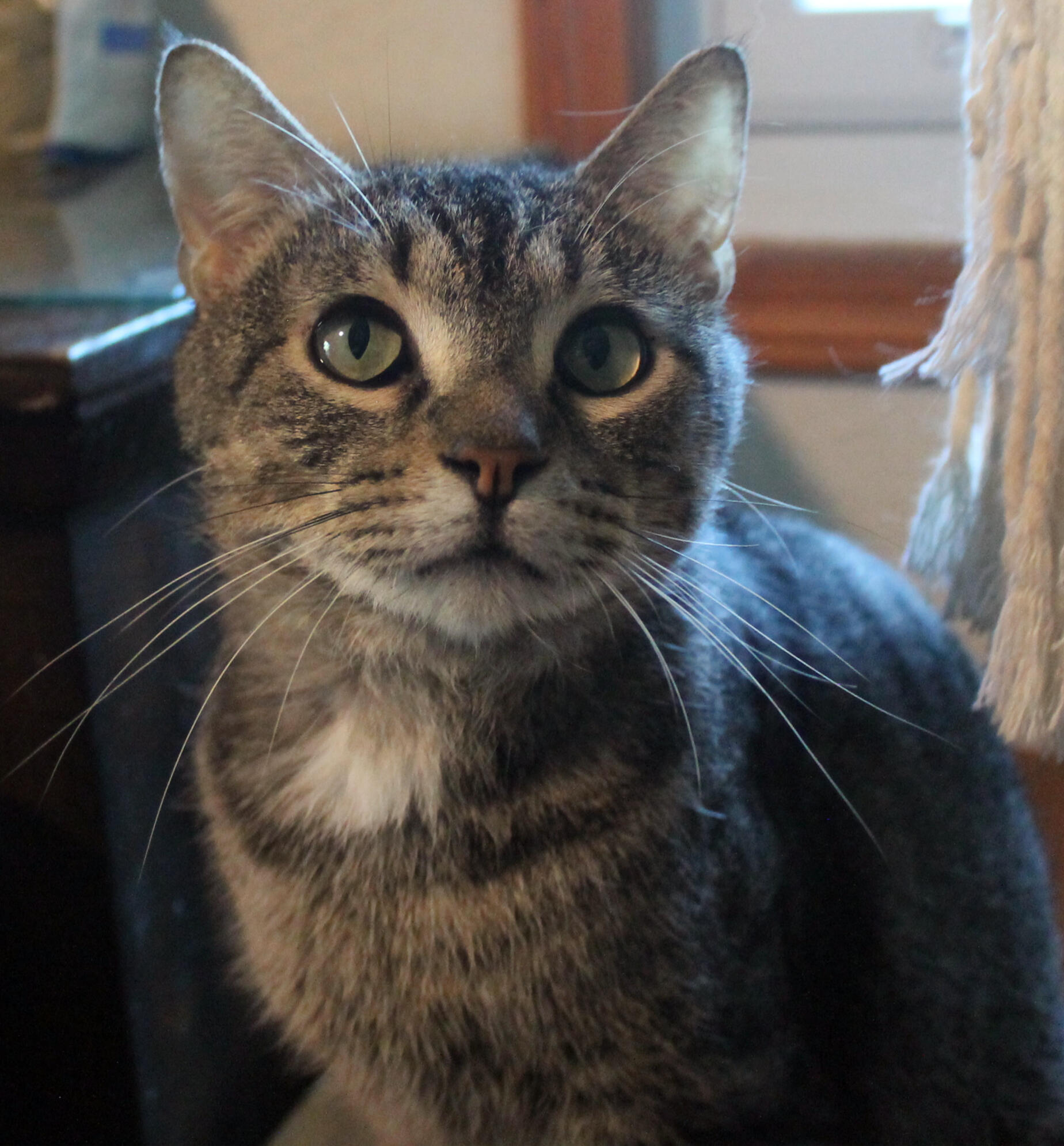 This sweet, easy going lady has eyes so crossed, one is pointed all the way in 😂 She might not be looking at you, but she IS paying attention! Googley Eyes is friendly, affectionate, and very gentle. She loves to cuddle humans, and enjoys the company of other cats. She is also a very large cat, rather than a tiny dainty girl 😅 She will happily be carried around, if you can lift her!
