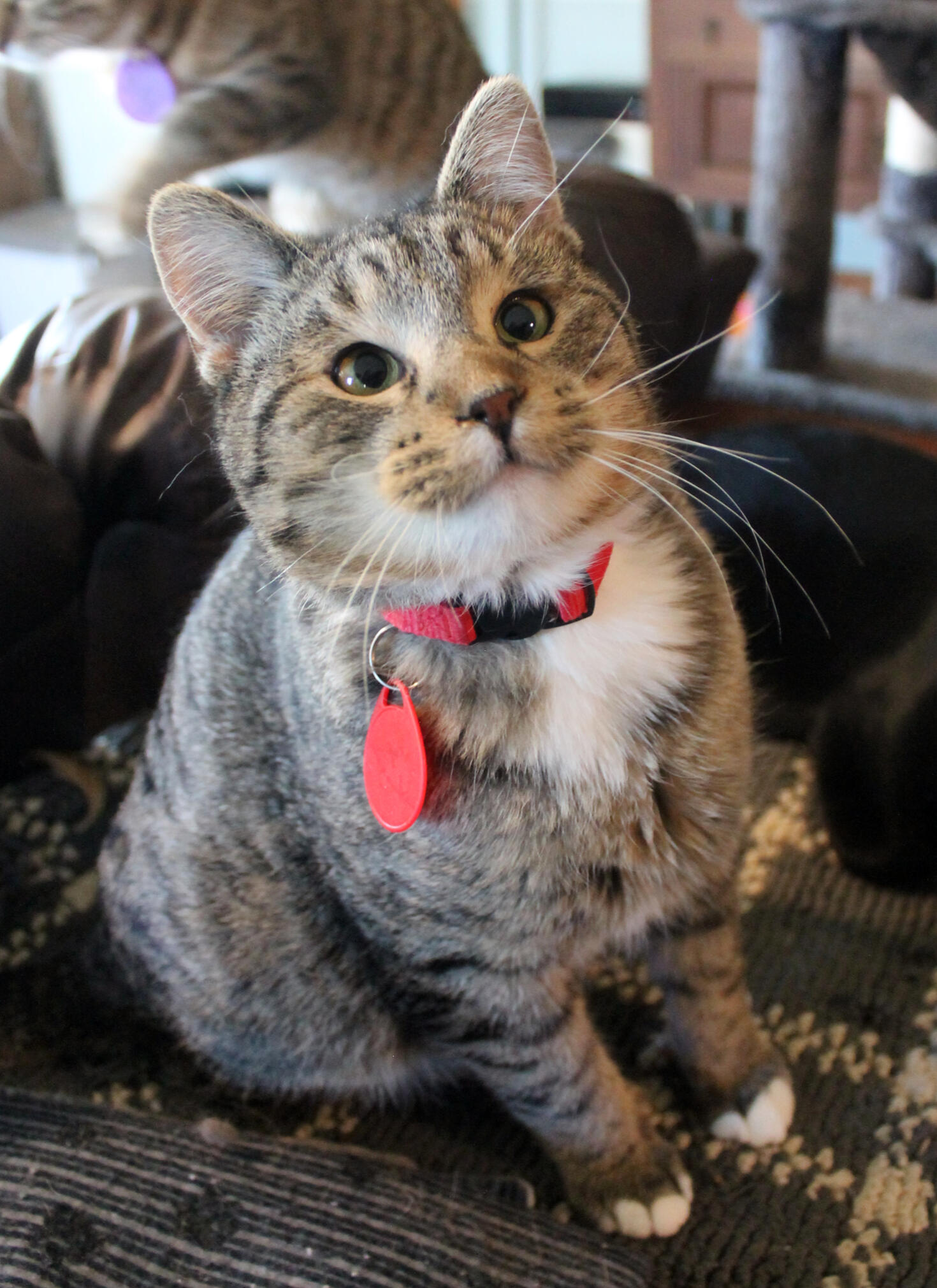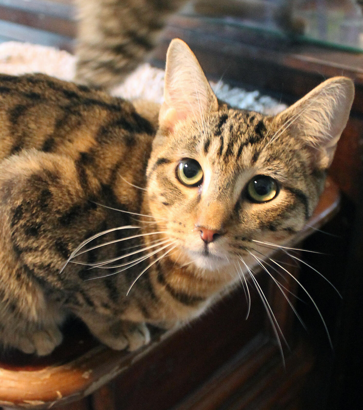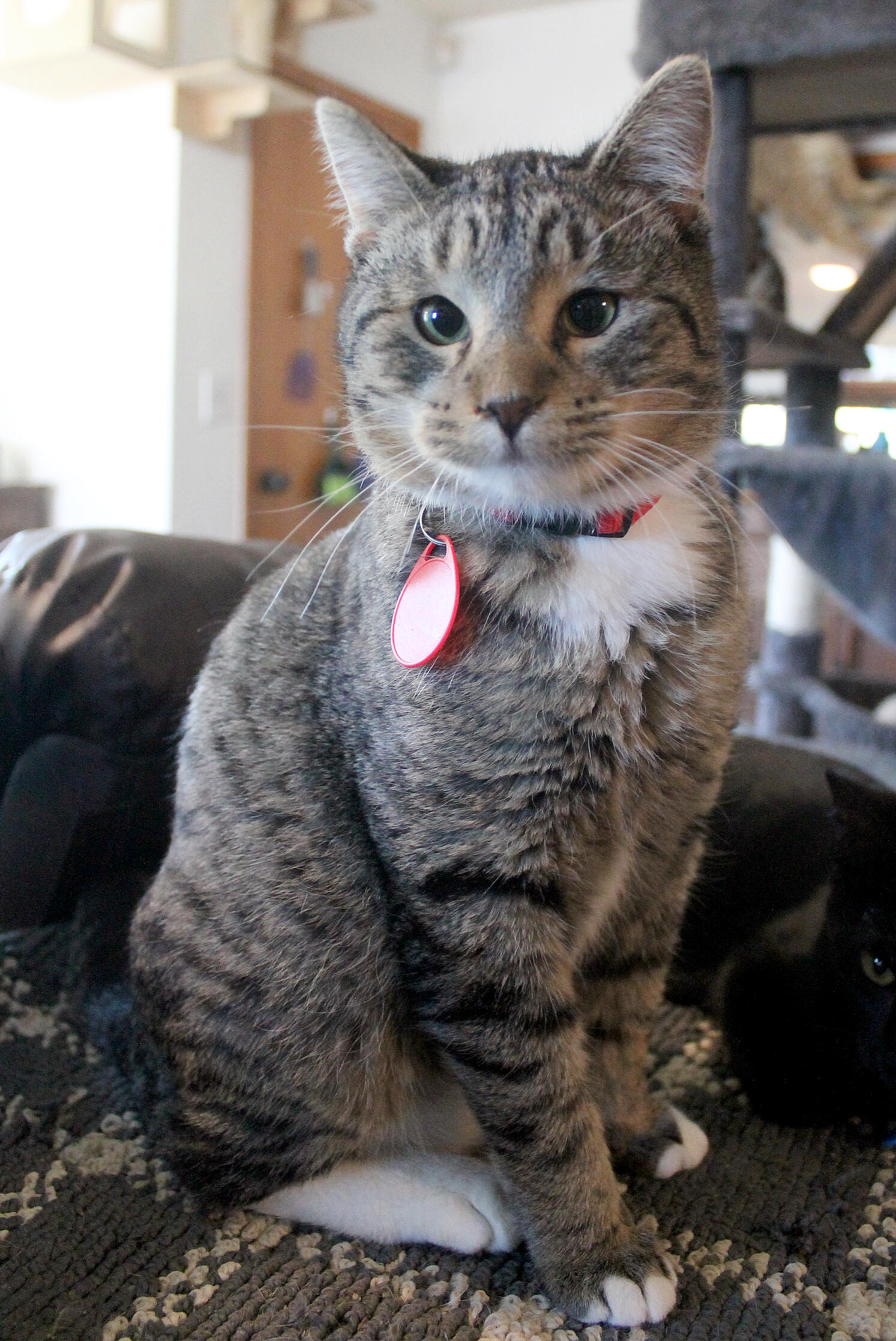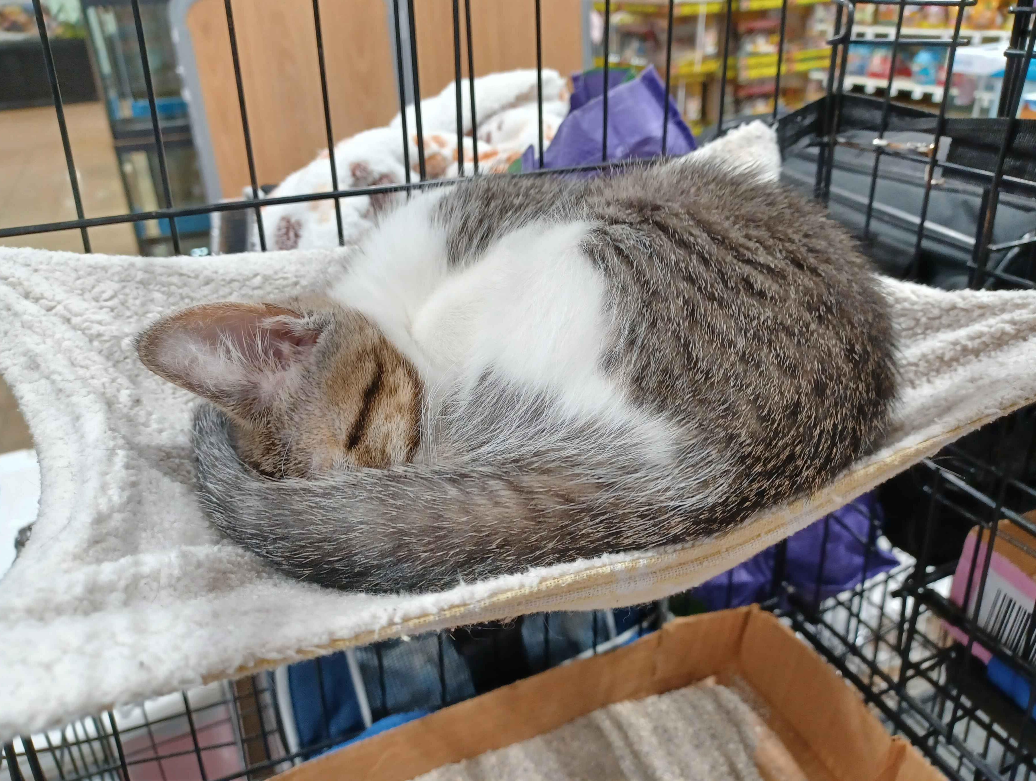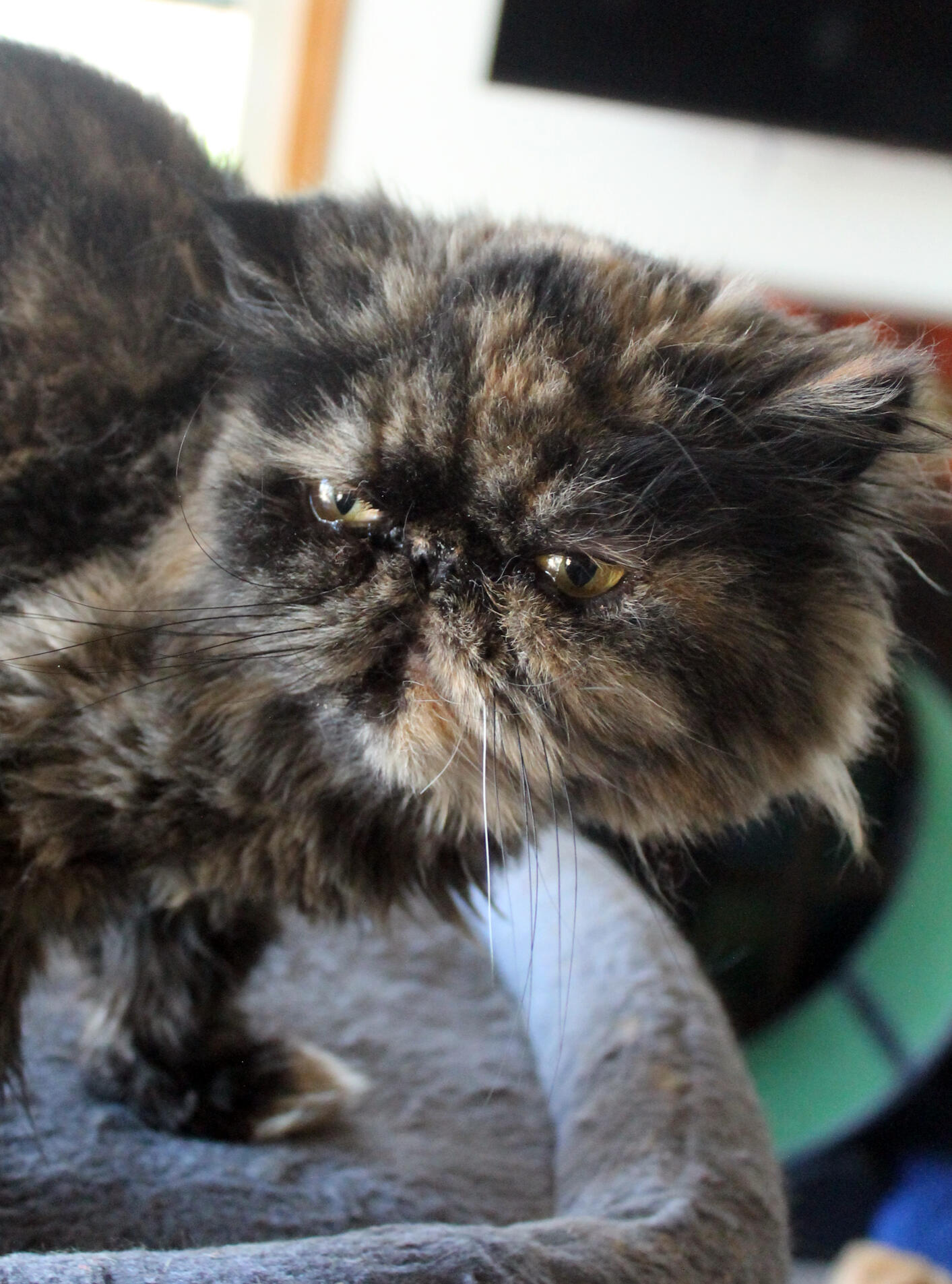 This sweet, easy going lady has eyes so crossed, one is pointed all the way in 😂 She might not be looking at you, but she IS paying attention! Googley Eyes is friendly, affectionate, and very gentle. She loves to cuddle humans, and enjoys the company of other cats. She is also a very large cat, rather than a tiny dainty girl 😅 She will happily be carried around, if you can lift her!