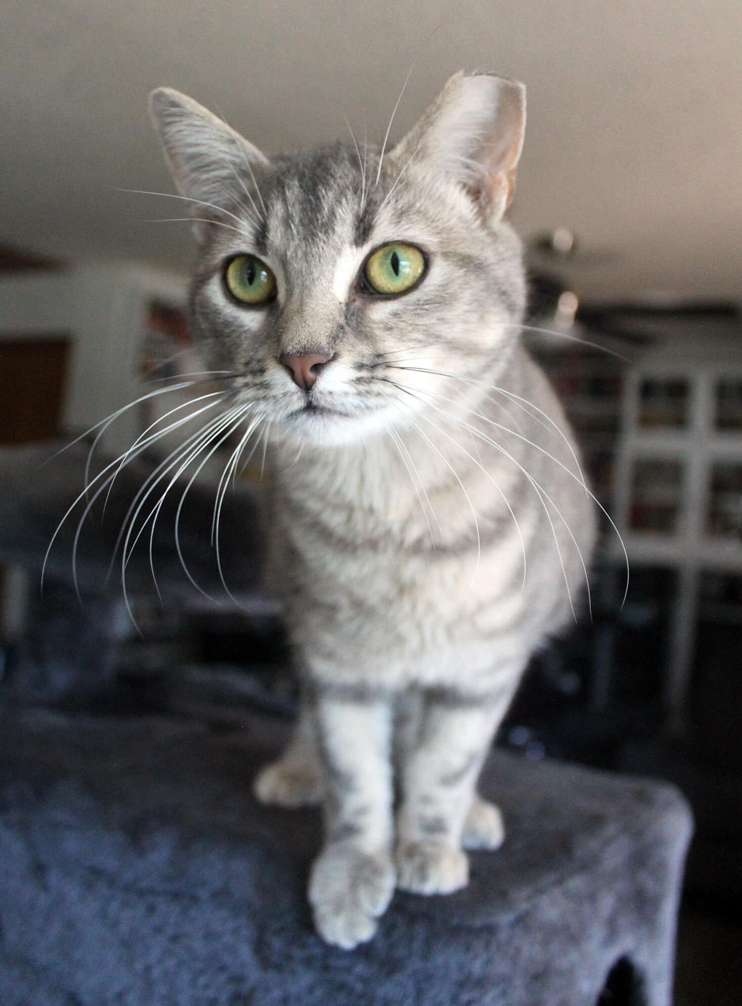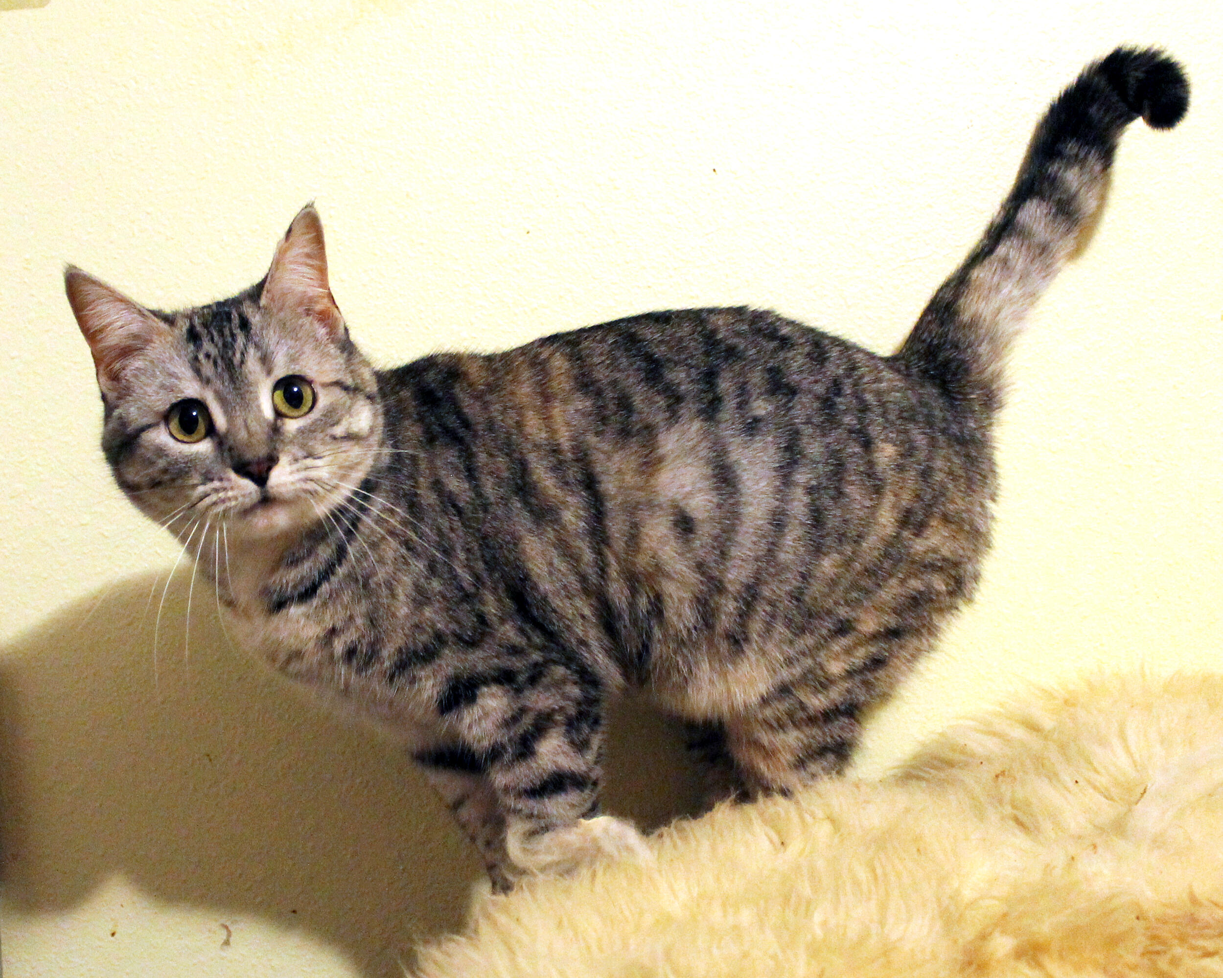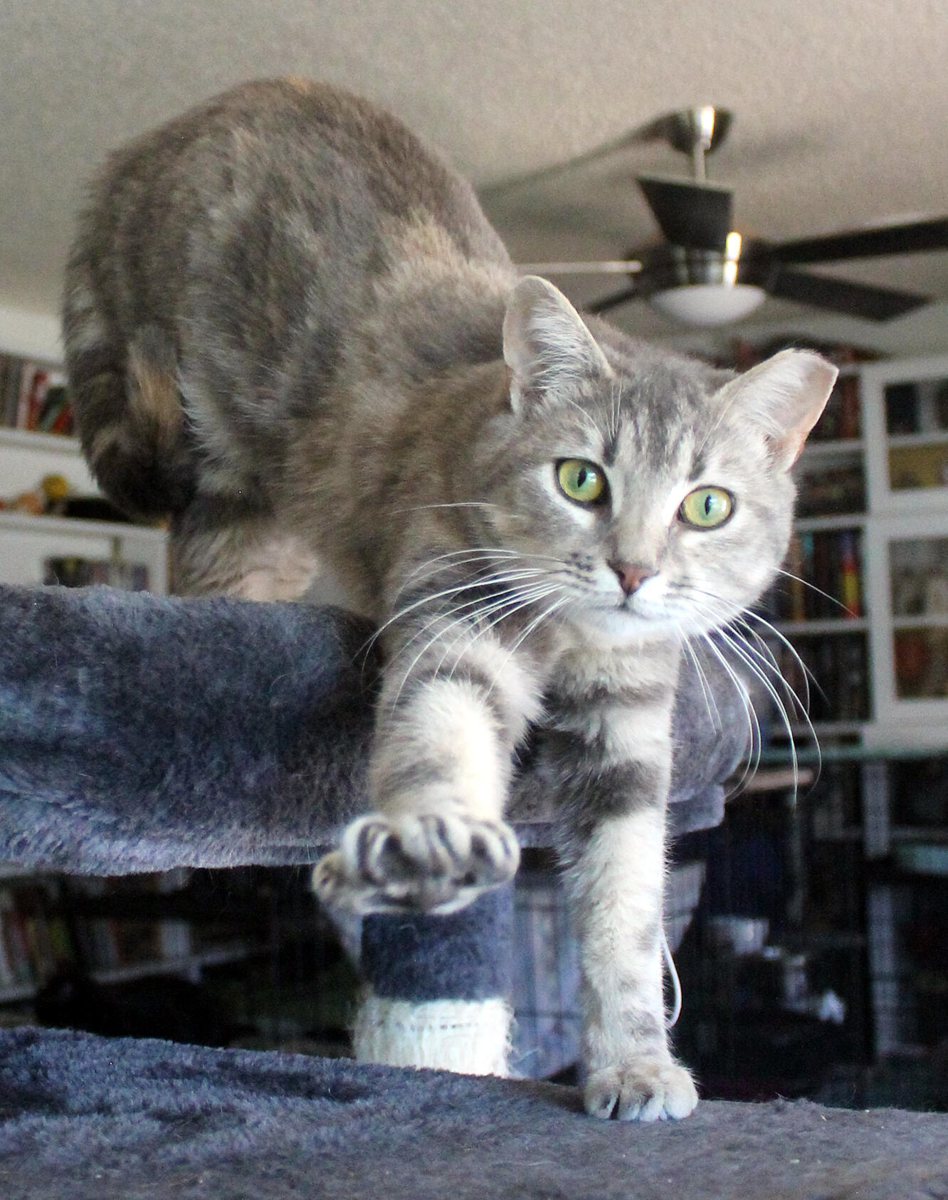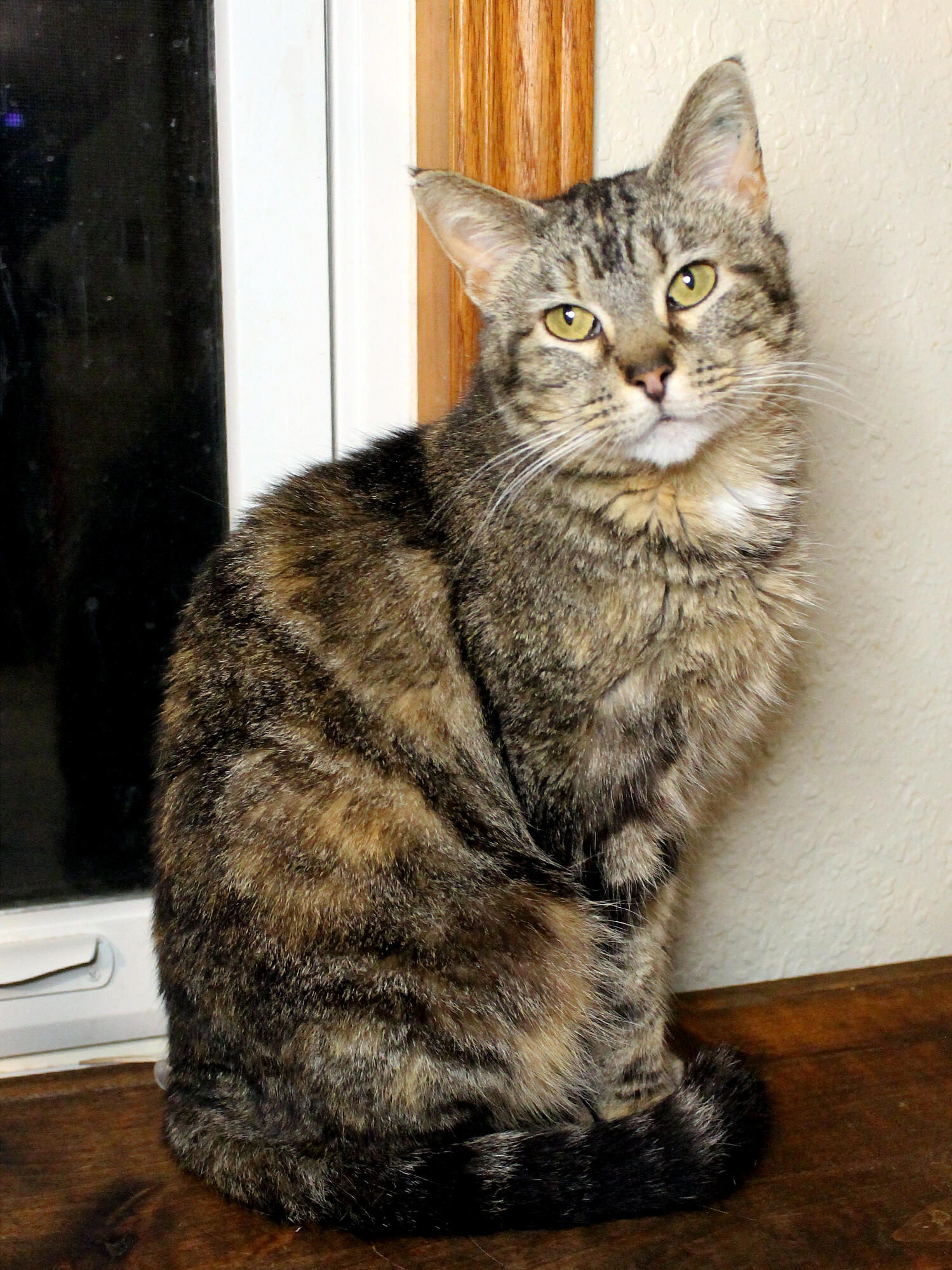 Penny is a friendly former feral kitty who has decided inside life is pretty ok so long as there's lots of toys. She is pretty outgoing, and quick to chase any string or ball you offer.Other cats and polie dogs are ok, and even kids are alright so long as they understand that Penny will set boundaries and expect them to be respected.