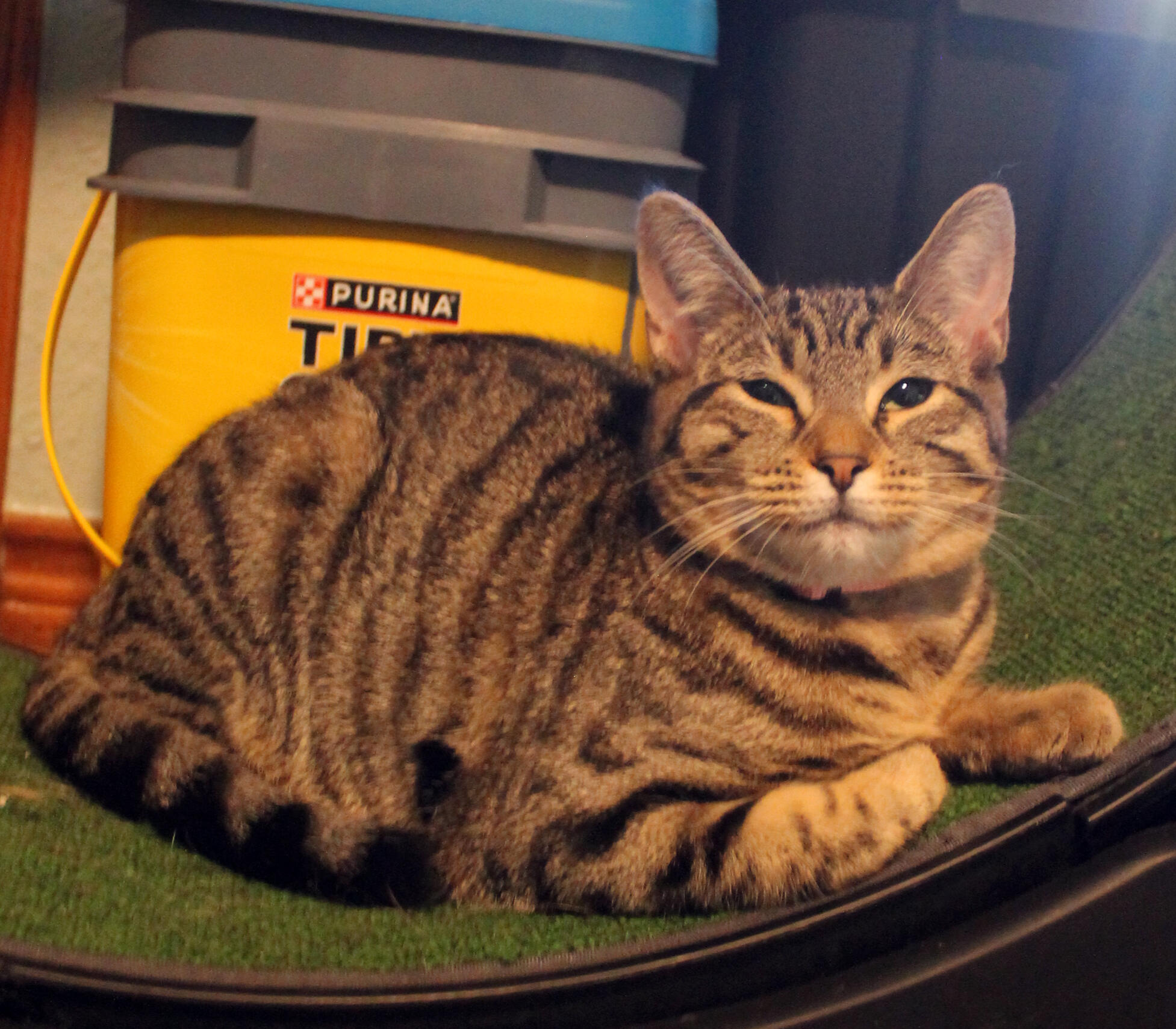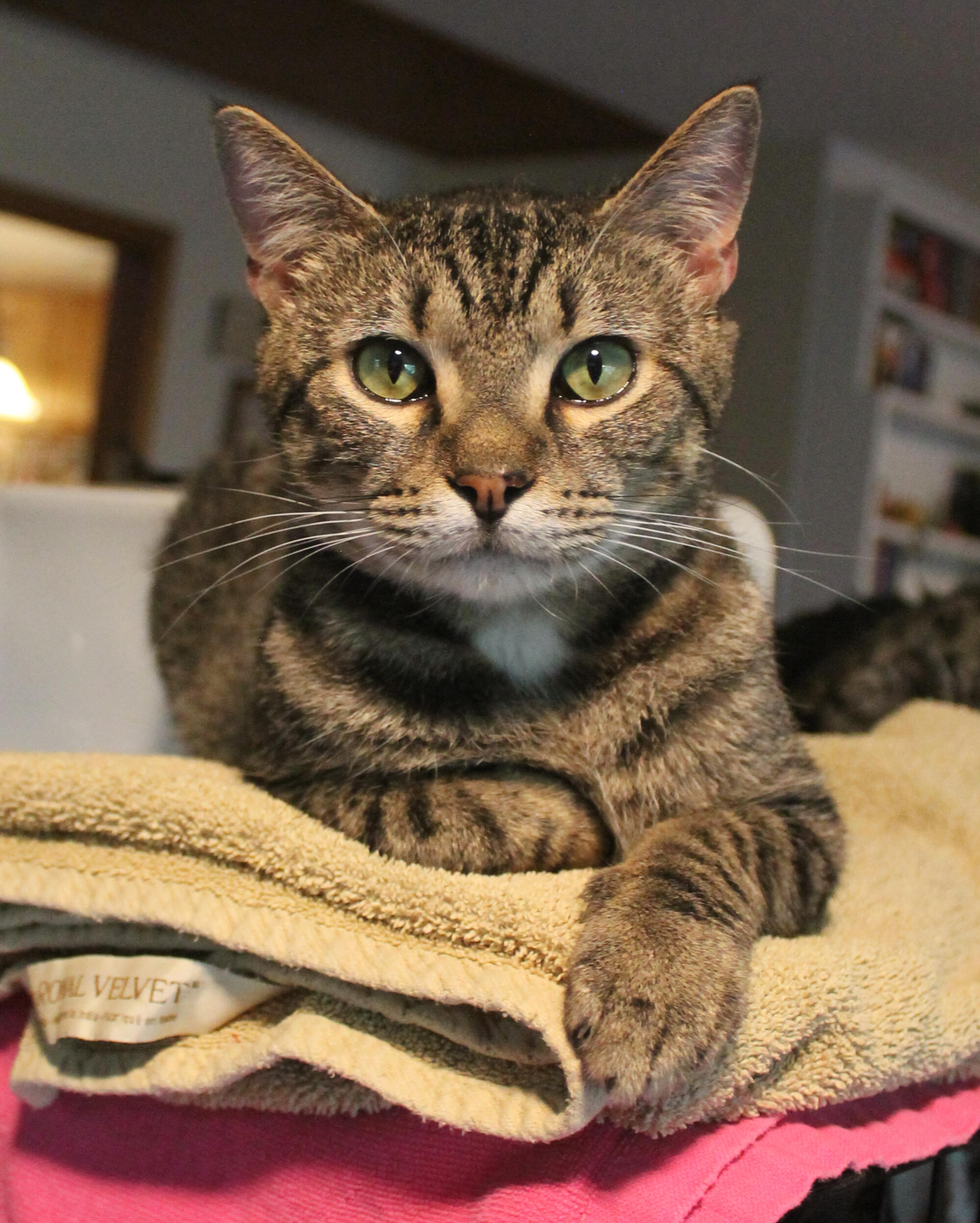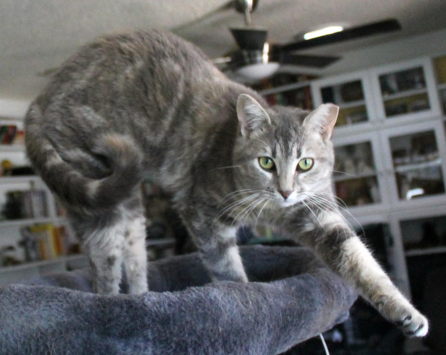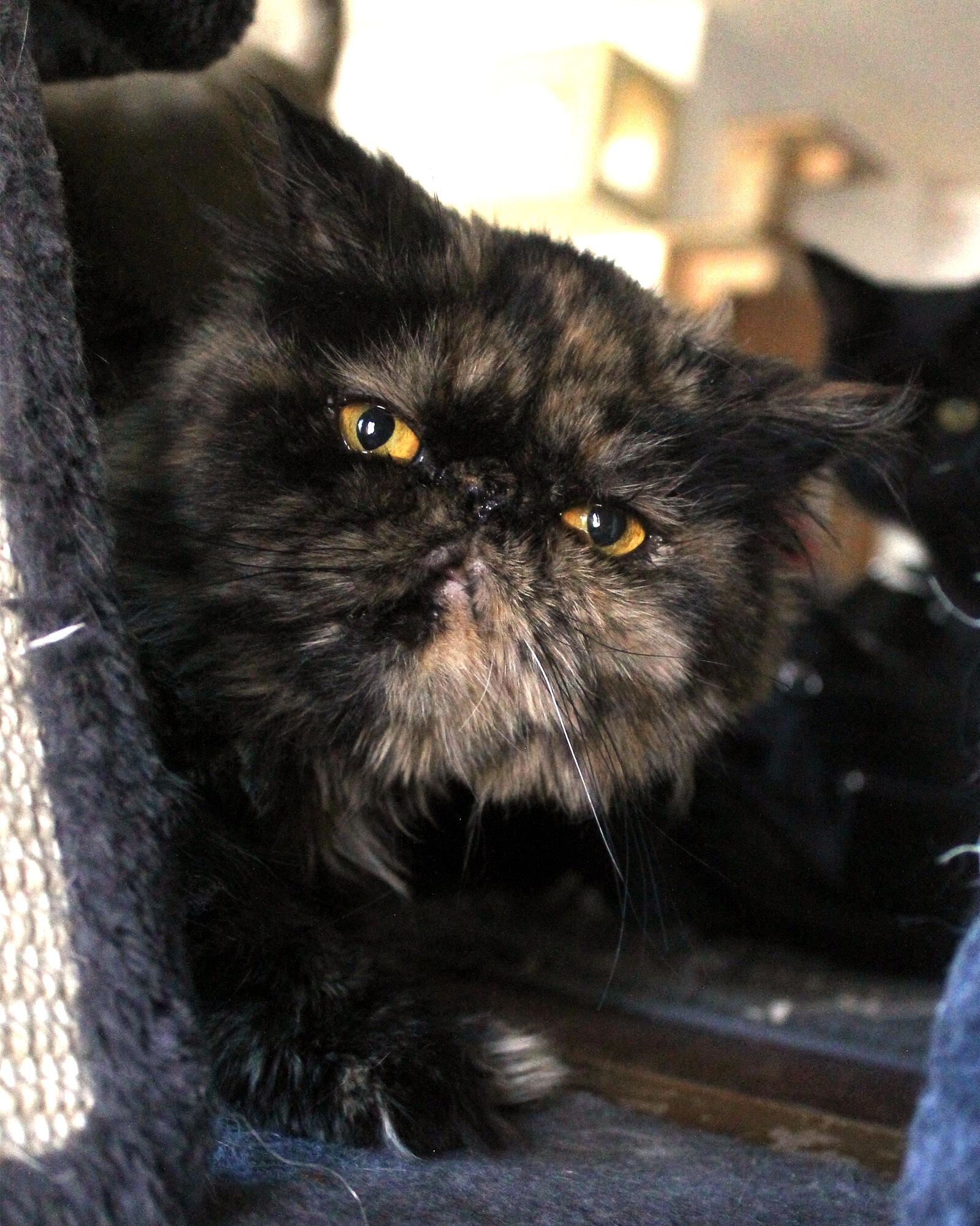 This grumpy girl raised her kittens in the rescue, but would really rather not deal with humans touching her. Unfortuantely, that makes it very difficult to medicate her injured eye. It's taking time to earn her trust.