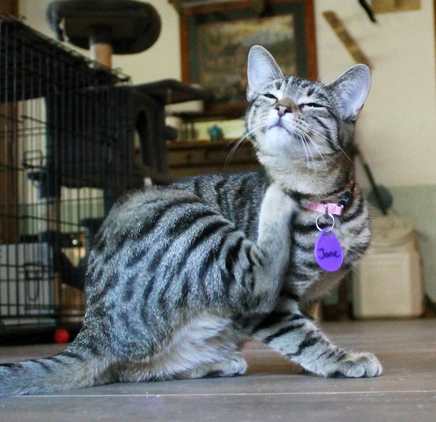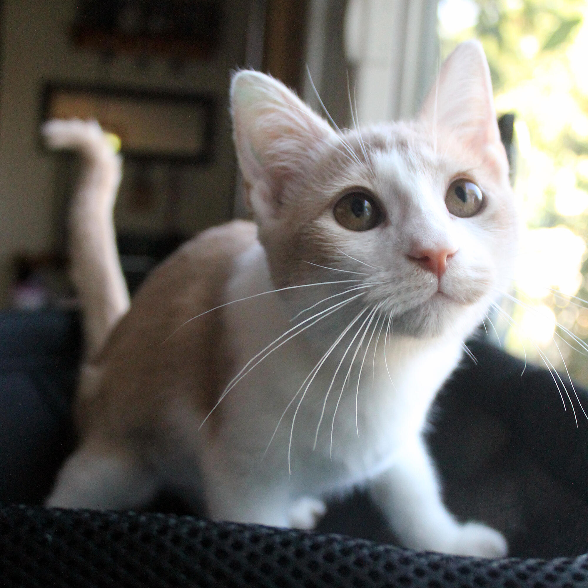Jane is the biggest sister in her litter, and can be a little shy at first. Once she knows she's safe, she warms up fast and wants to you pat her booty as often as you'll tolerate. She's a very silly kitten who likes feline company in the rescue. She's often found hanging out with her sister Parrot, Fluff or any of the adult cats. She has been ok with the dogs in the rescue, and we suspect she would be totally fine with polite children as well.