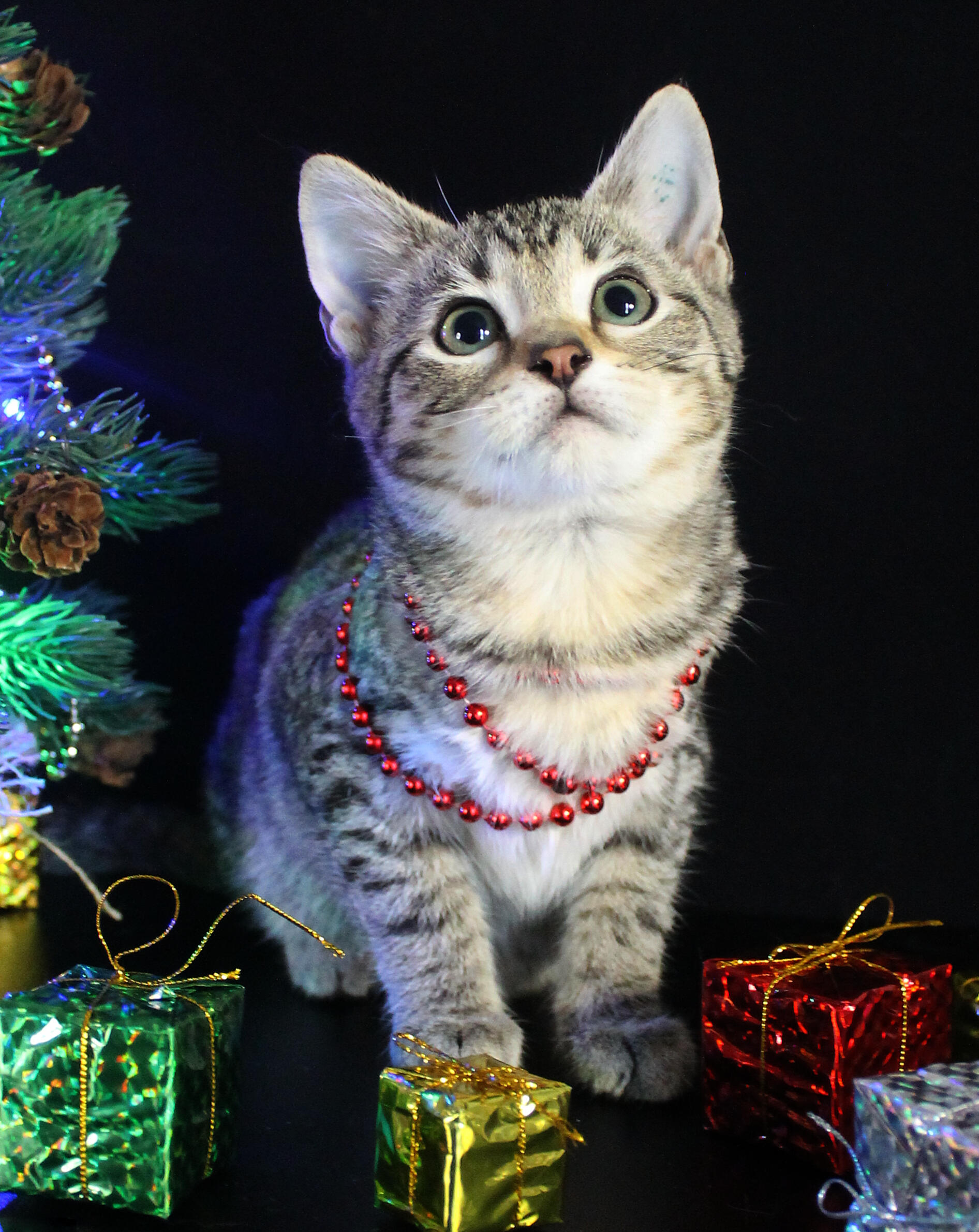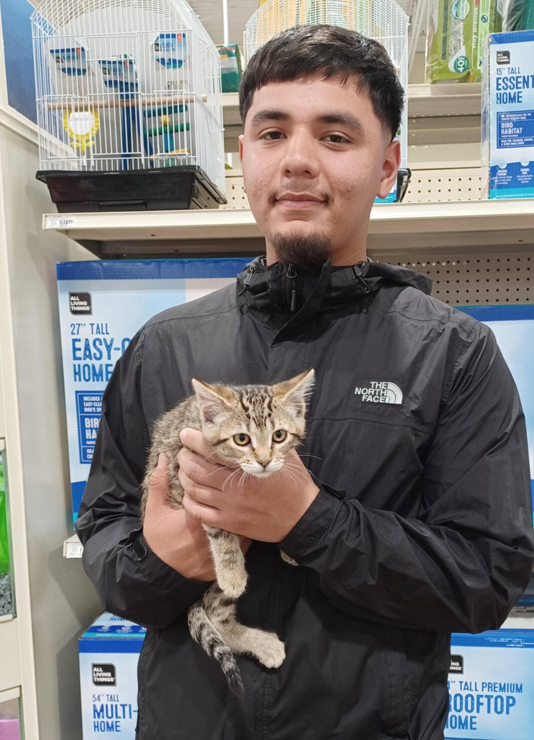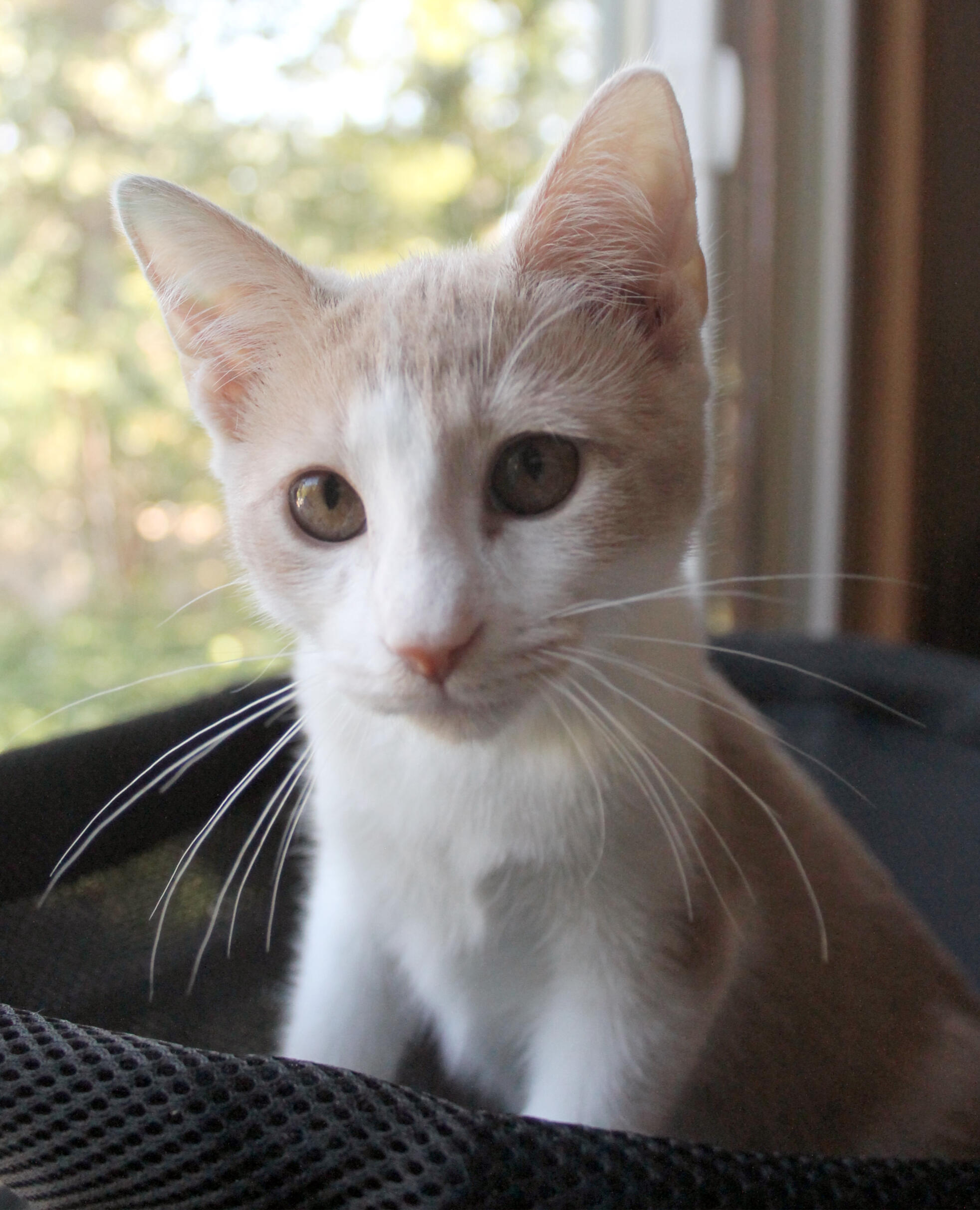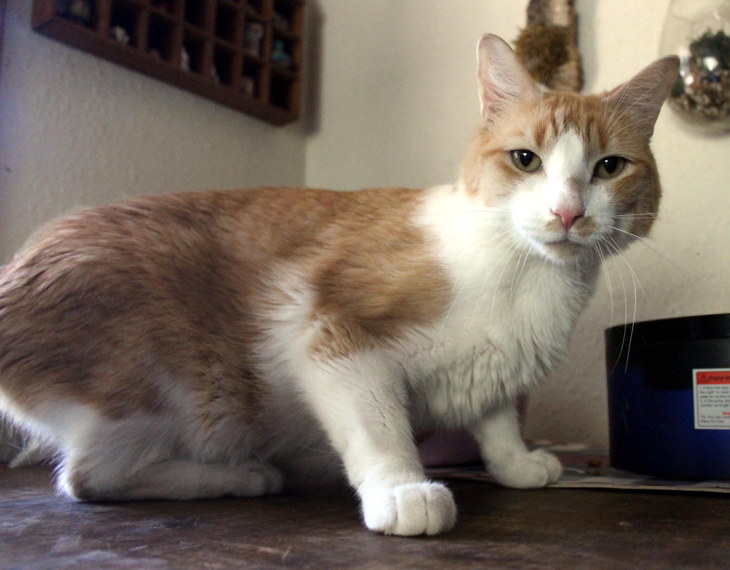 Snickers is a bit of a special case! One of his brothers unfortunately nursed on his bottom parts when their mother was killed. This did damage to him, and he needed reconstructive surgery. He pees a little differently, and looks like a female from behind, thats all! He was also pretty small for his age, and looks closer to the size of a 4 month old kitten.This sweetheart LOVES to cuddle- with people, and other cats! He must go to a home either with a friend, or to a family who already has a cat in the house.