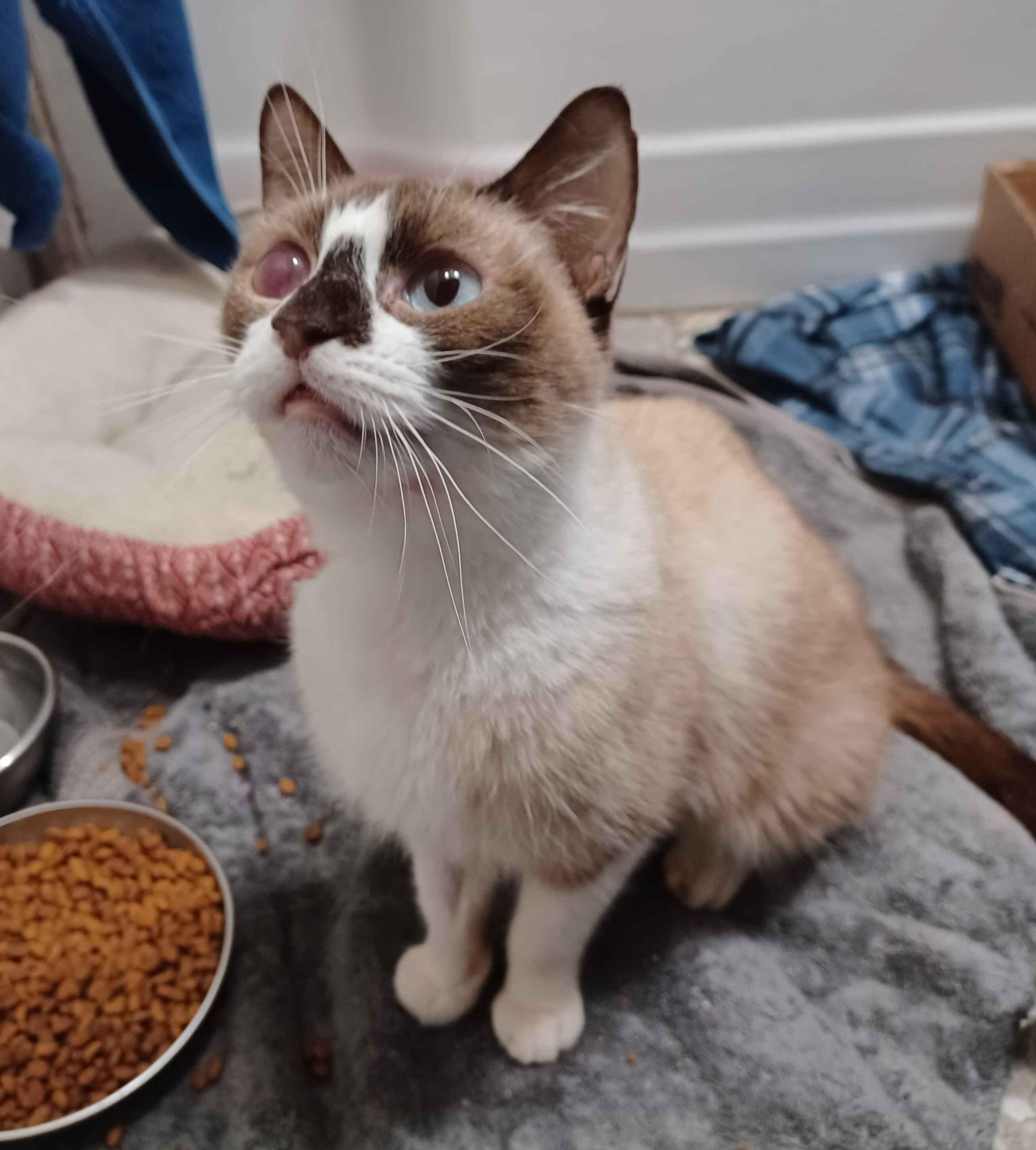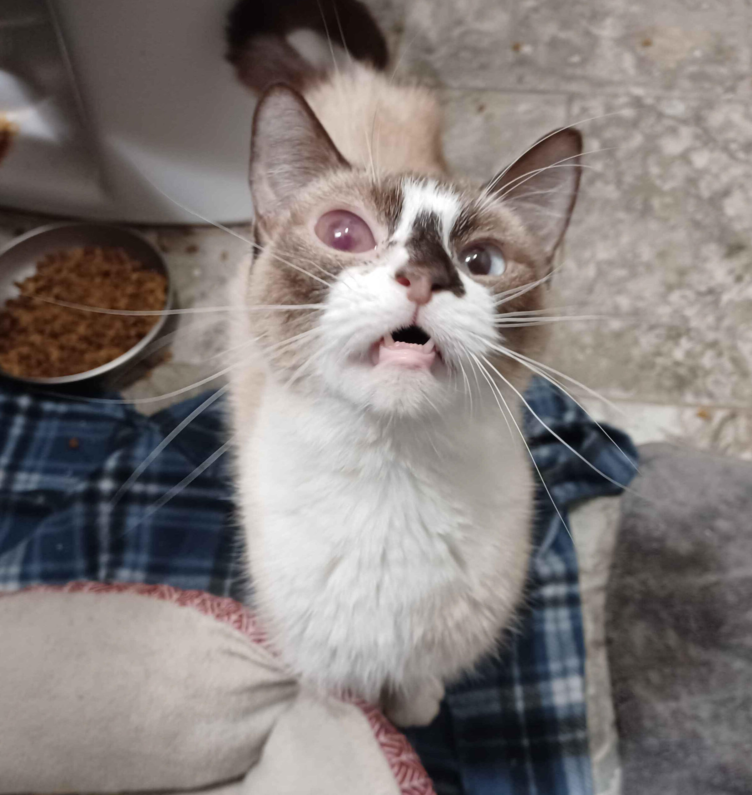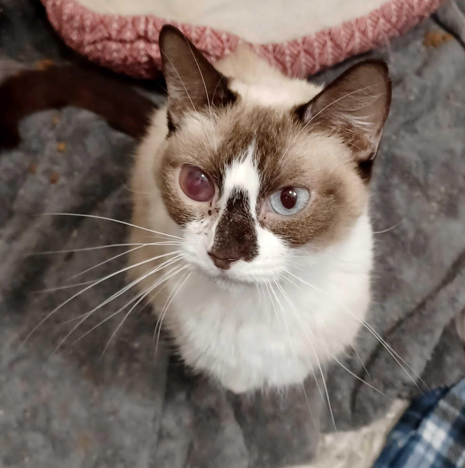 Sweet Girl is only 1 year old, but clearly had a very hard life outdoors. The world has been painful and very scary, so she was very slow to settle in at the rescue. She currently lives in our Shy Cat room, and has made friends with Goldy and Mister, two other very shy kitties.Due to her limited sight, Sweet Girl will need a very patient adoptive family, and humans who understand that changing furnature around on a blind girl makes life extra tricky 😂 She would prefer no rowdy dogs or rough children in her home, but gentle and polite ones may be ok with slow introductions.