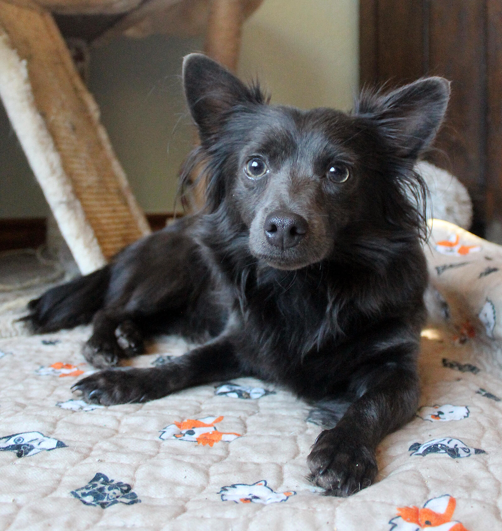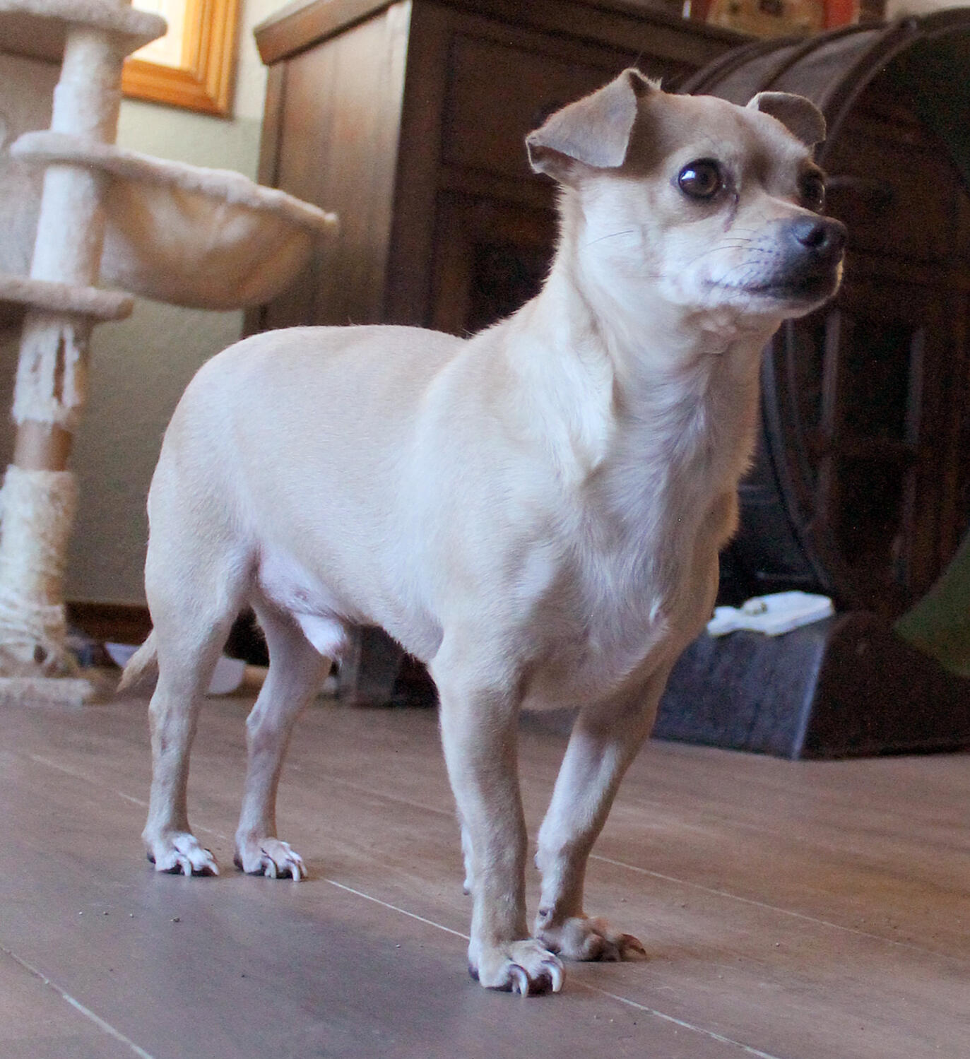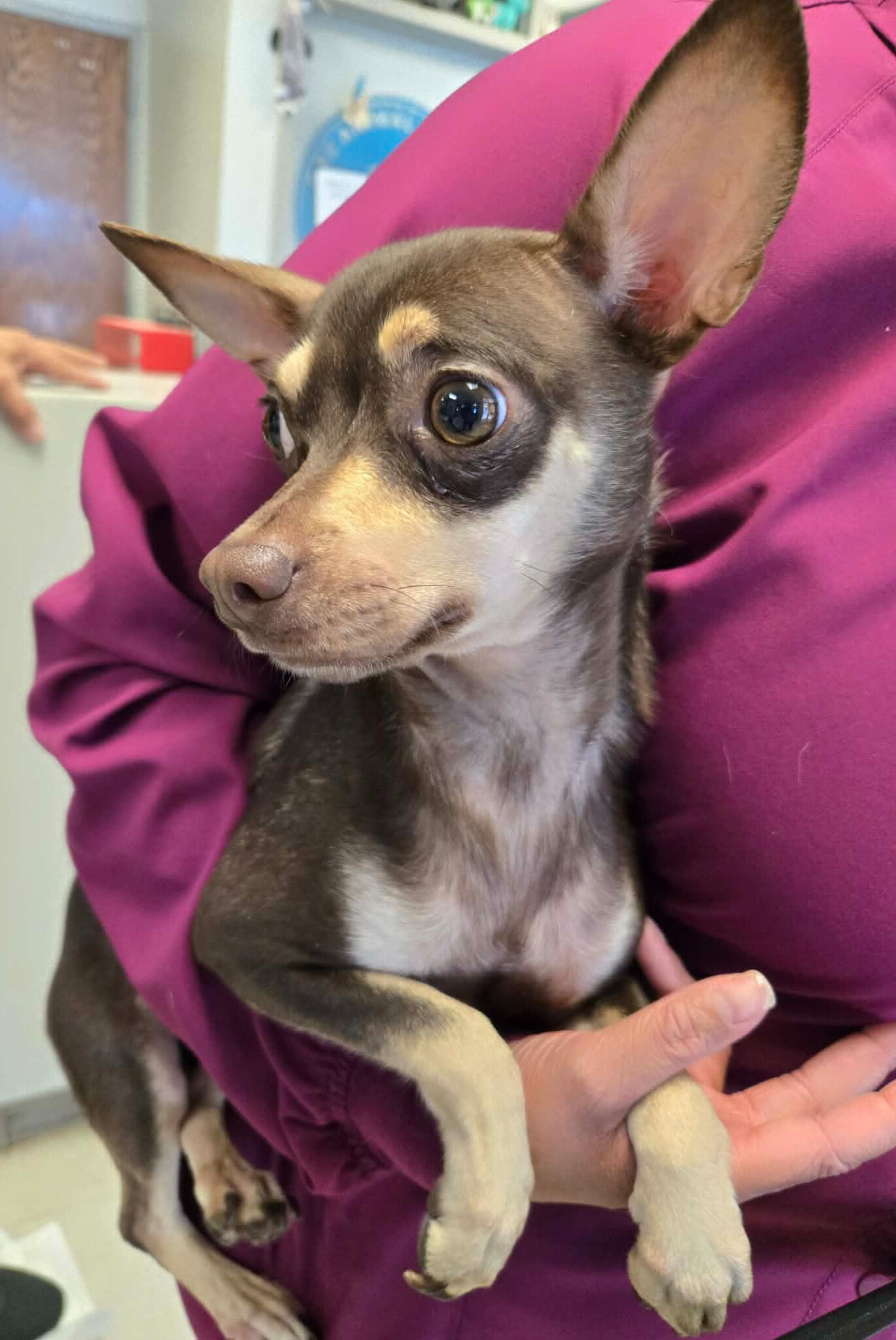 Reggie arrived with a pretty nasty upper respitory infection, and is undergoing treatment with our vet. He is terrified of being in a cage, so we are working with him to relax and get healthy. He loves other little dogs and cats, but kids are a bit much for his tastes.