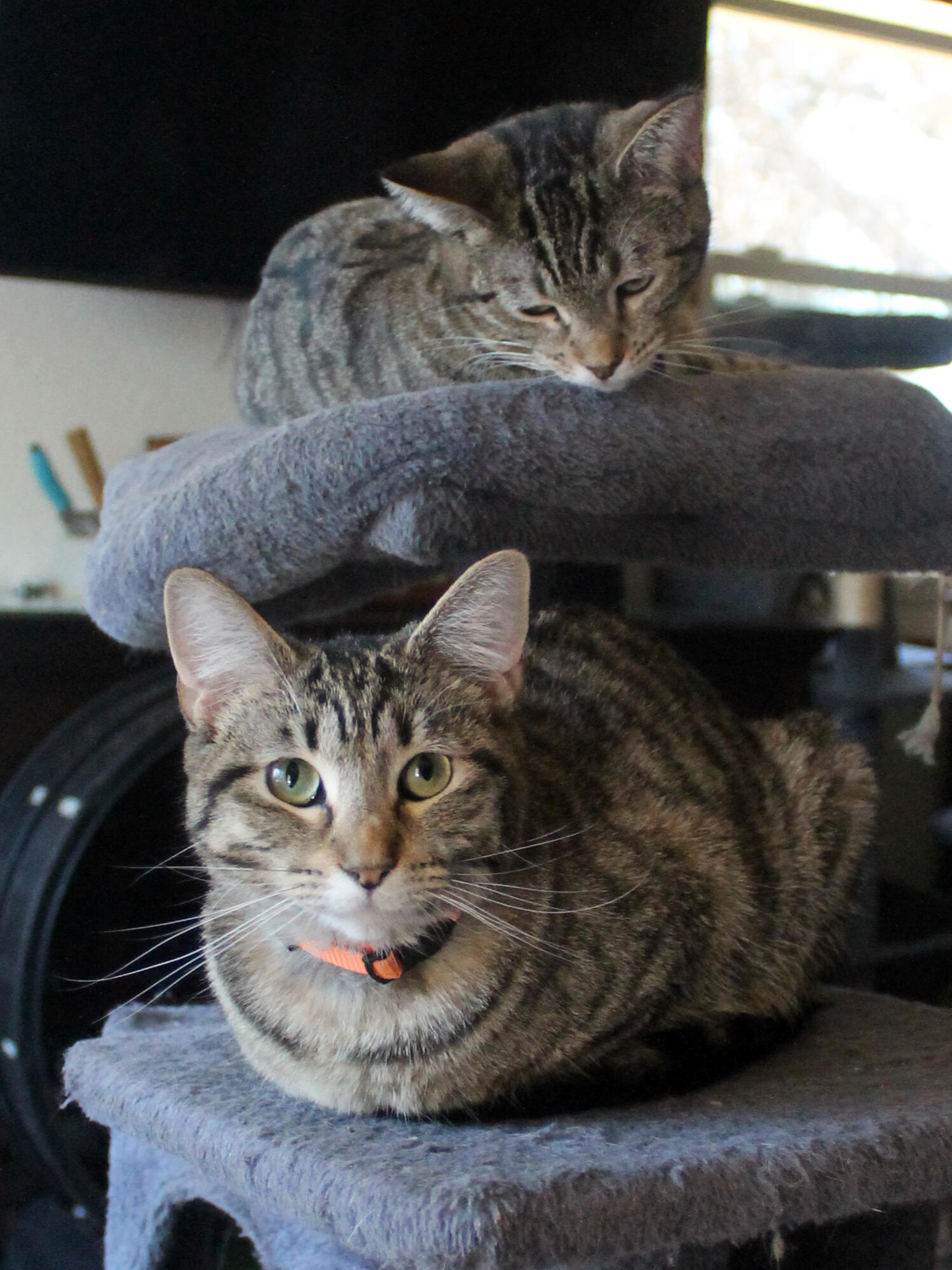 Parrot is much more shy than her sister Jane, but gets along with all the cats and dogs at the rescue. She'll come over to hang out, but it will take her a while to trust you enough to cozy up with you. She'd rather snuggle her sister!She is still a friendly kitten, but it's hard for any human to compete with home much she likes her sister's company 😂