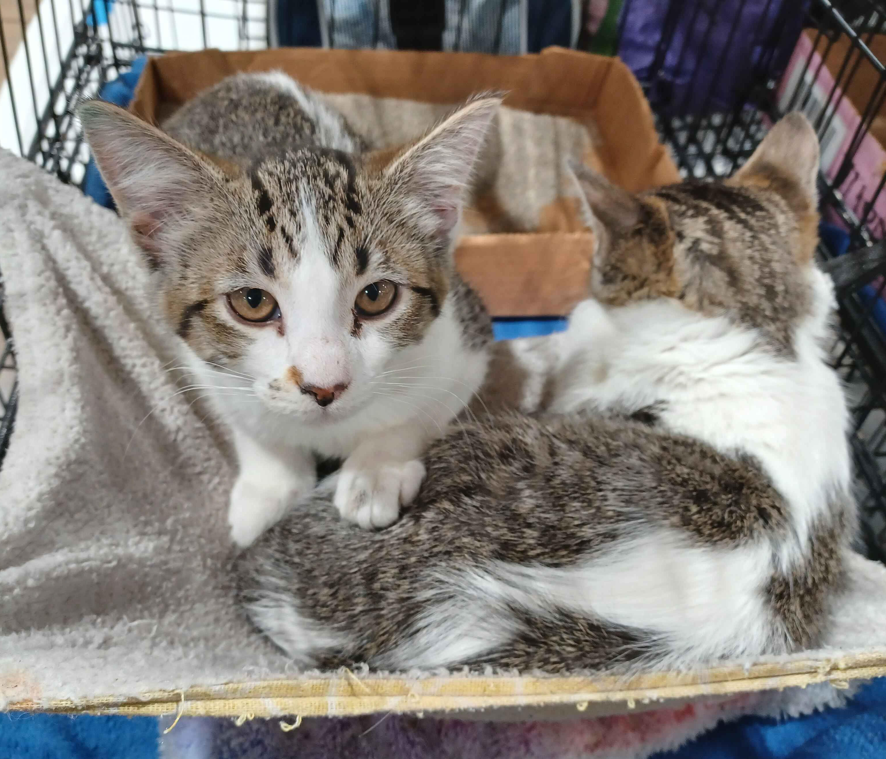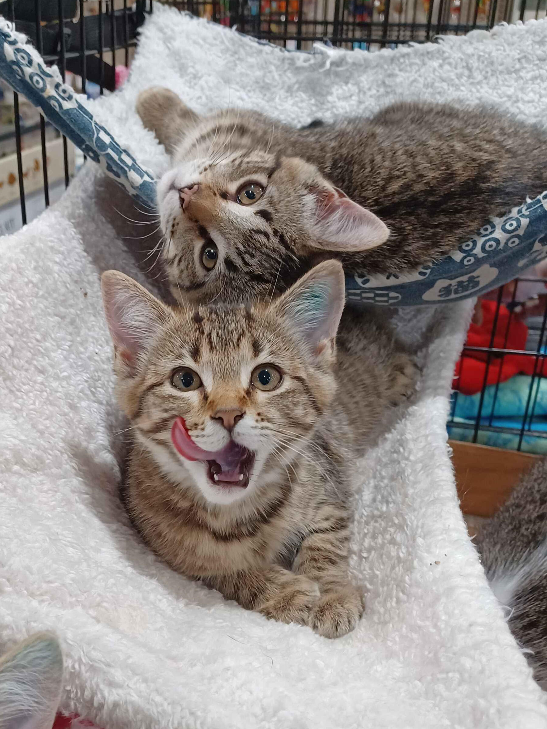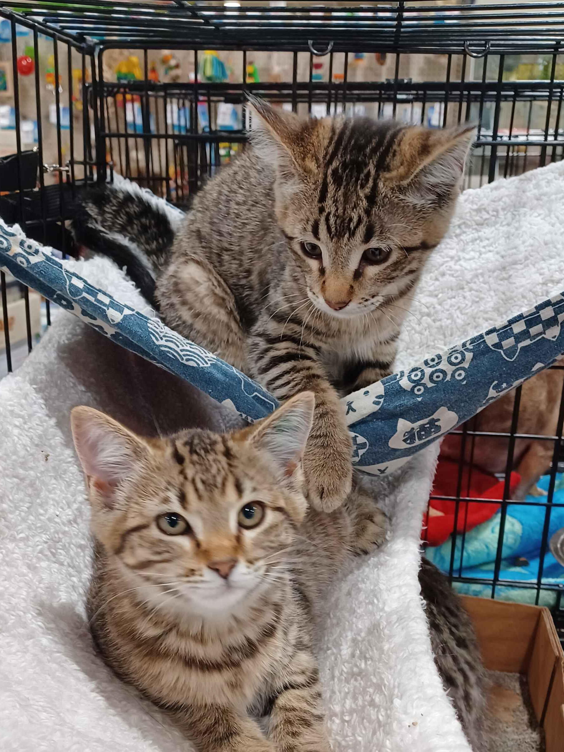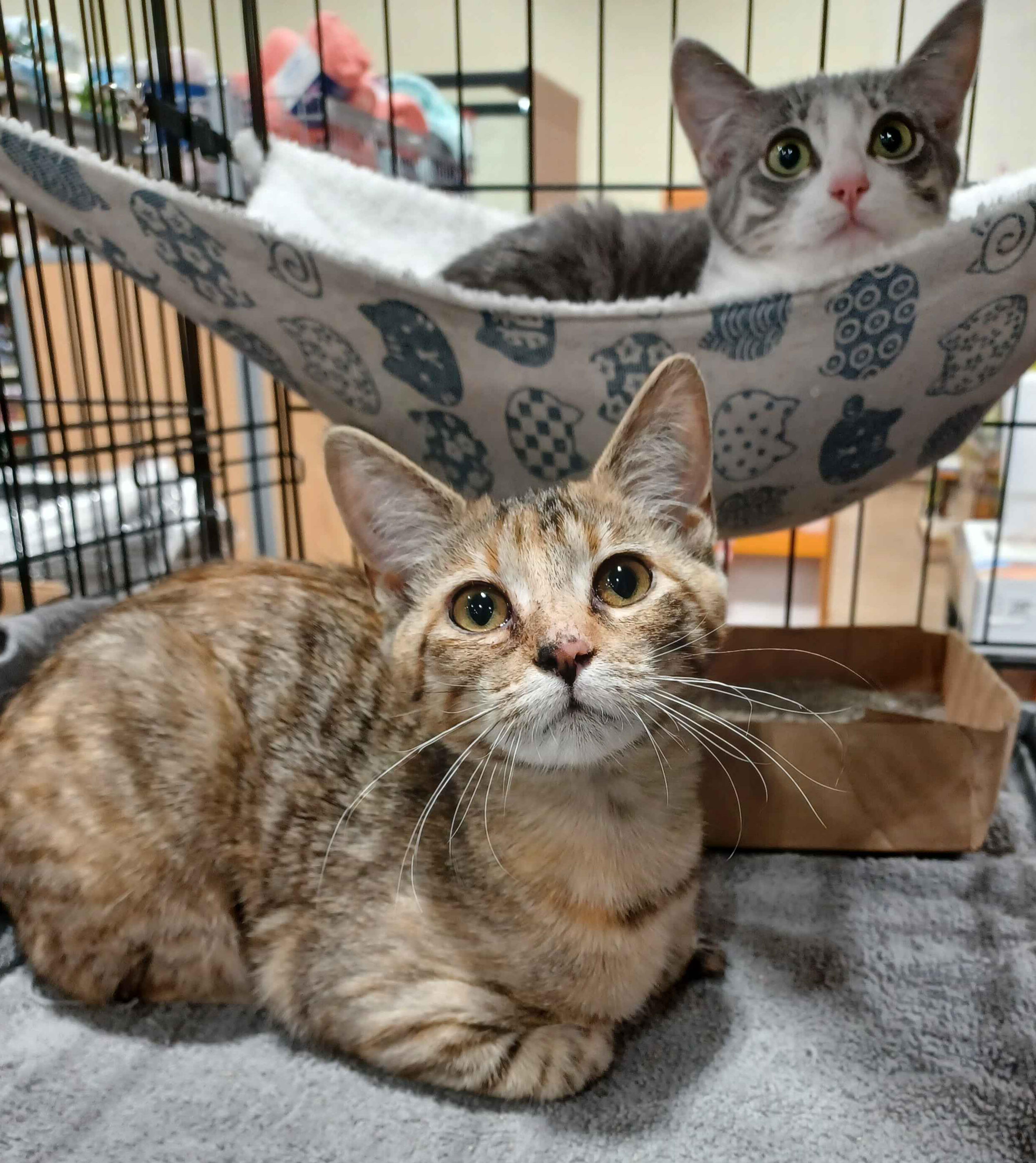 These kittens are in a foster home, so their only photos were taken at an adoption event.Ramen and Dumpling are gentle twin sisters who love to cuddle up together. It's pretty tricky to tell them apart! These tiny girls get along great with other cats, and are very used to children in their foster home.