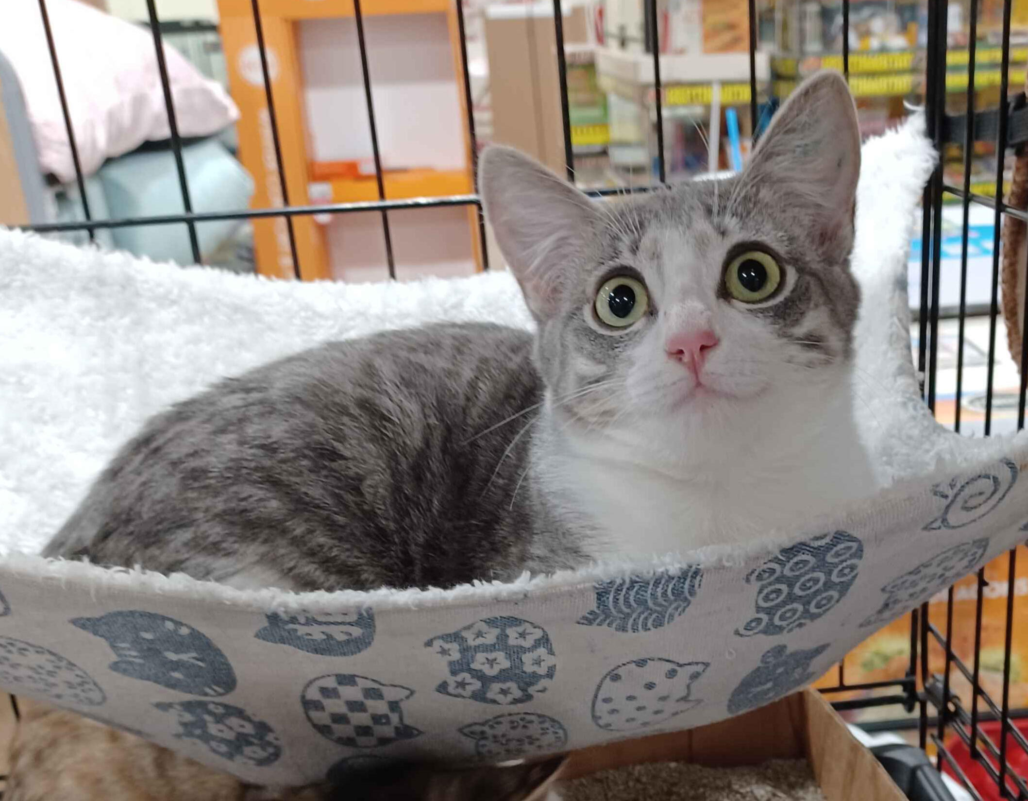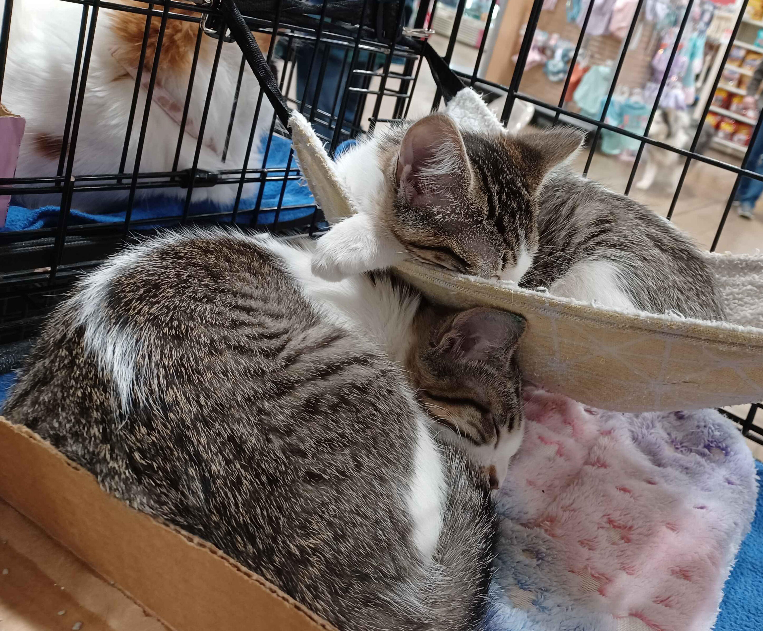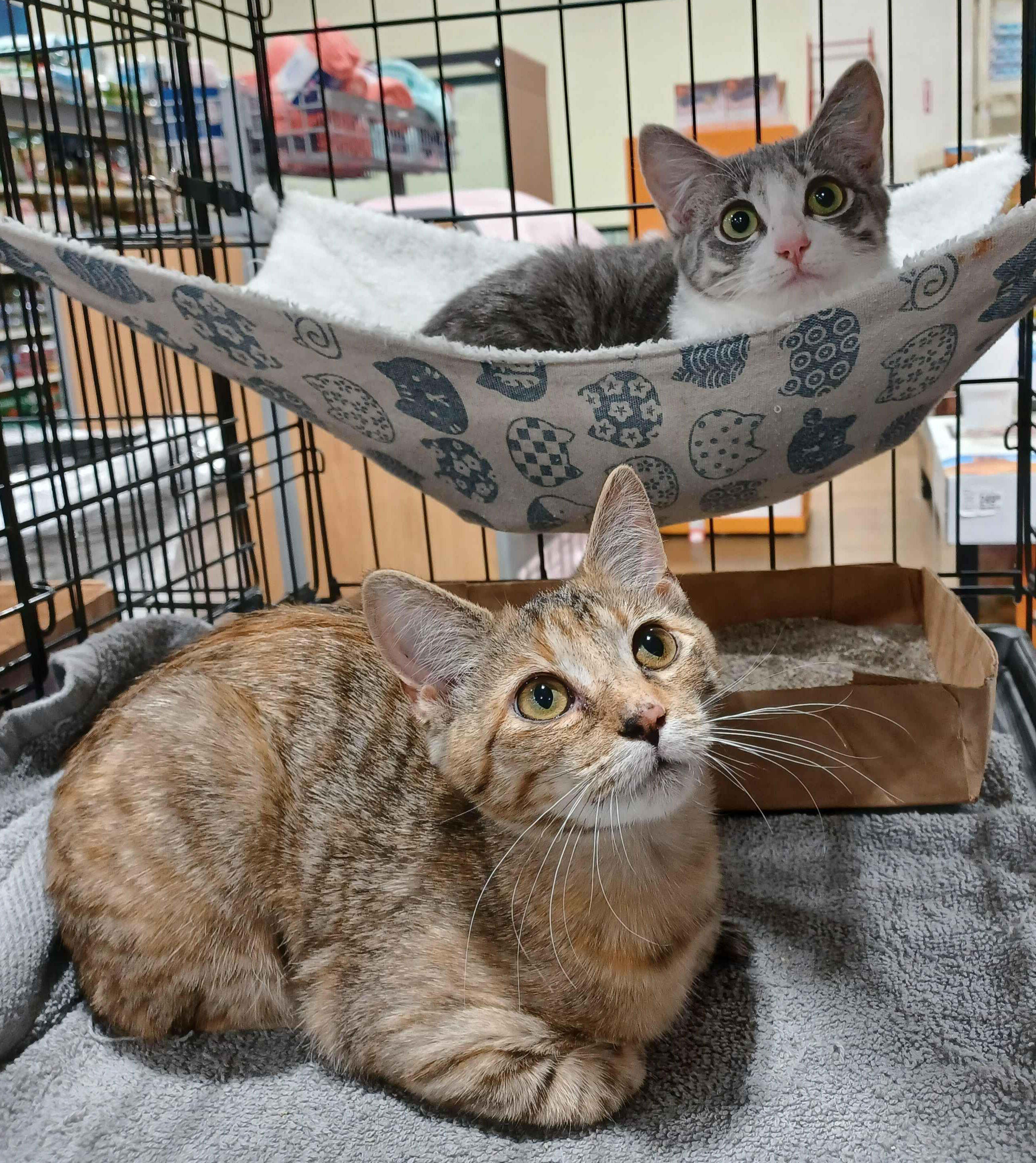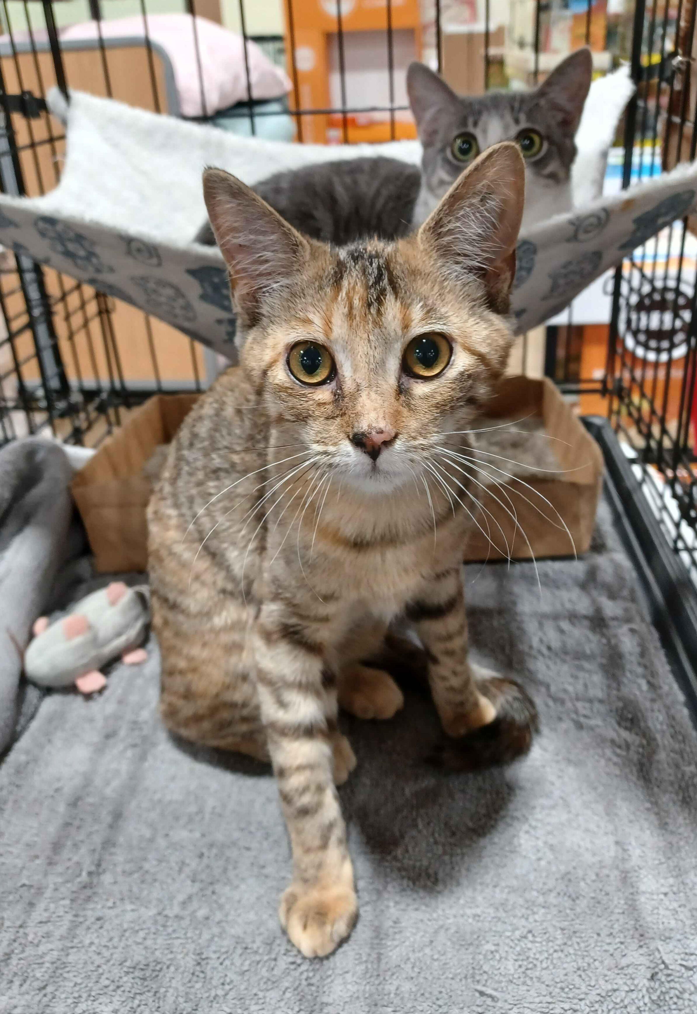 These kittens are in a foster home, so their only photos were taken at an adoption event.Ramen and Dumpling are gentle twin sisters who love to cuddle up together. It's pretty tricky to tell them apart! These tiny girls get along great with other cats, and are very used to children in their foster home.