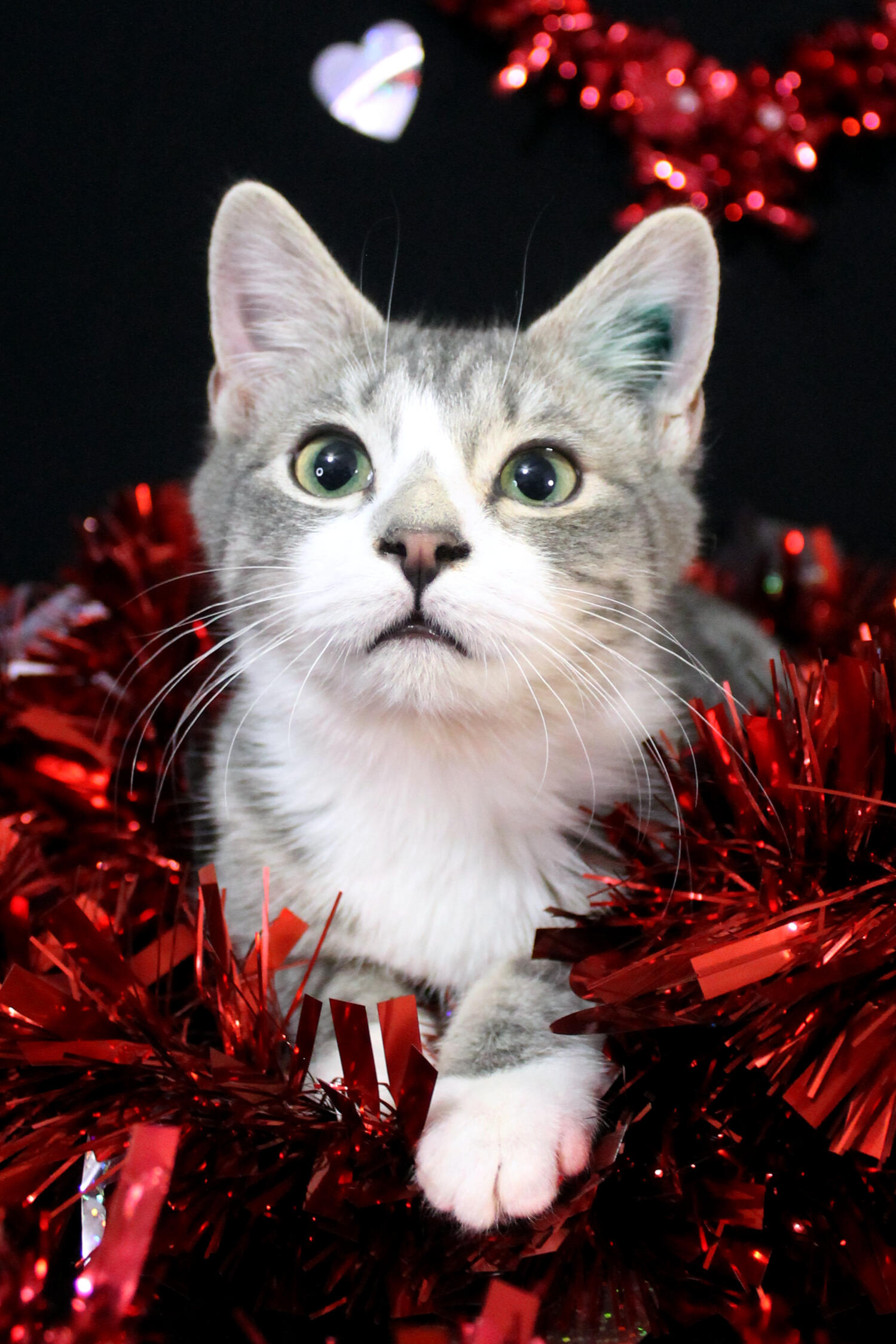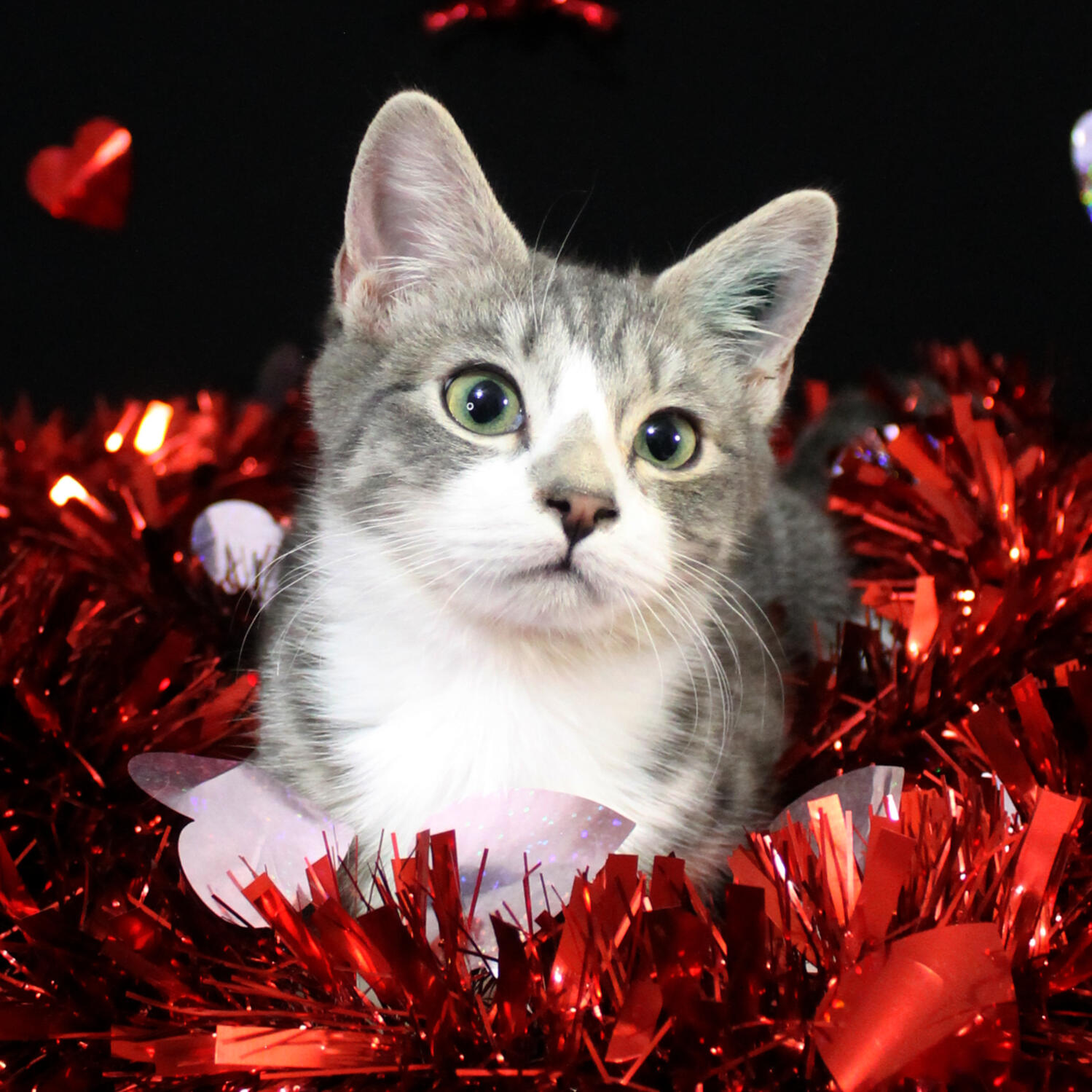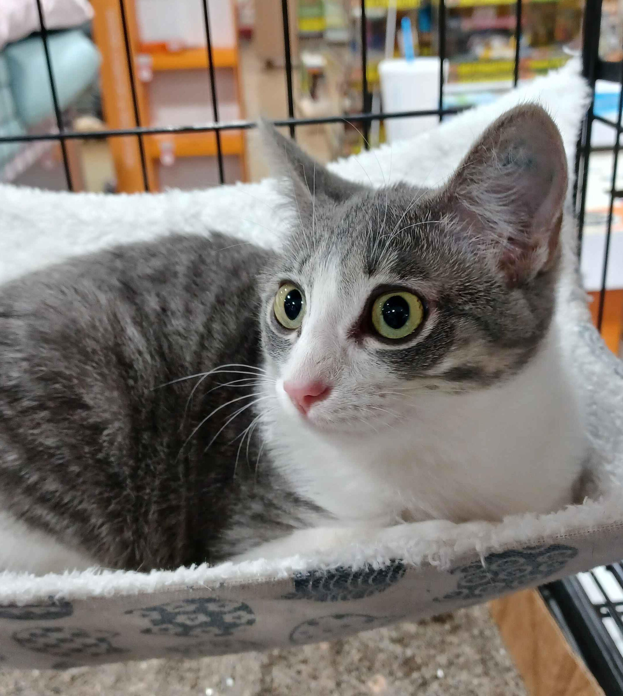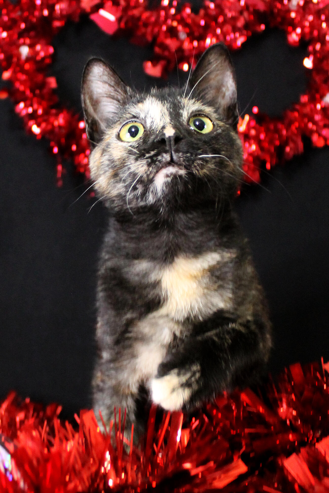 These kittens are in a foster home, so their only photos were taken at an adoption event.Ramen and Dumpling are gentle twin sisters who love to cuddle up together. It's pretty tricky to tell them apart! These tiny girls get along great with other cats, and are very used to children in their foster home.