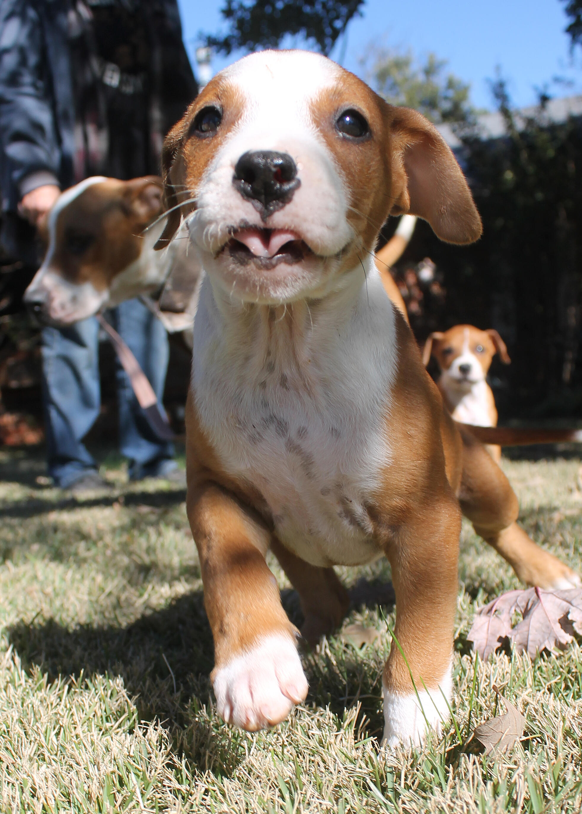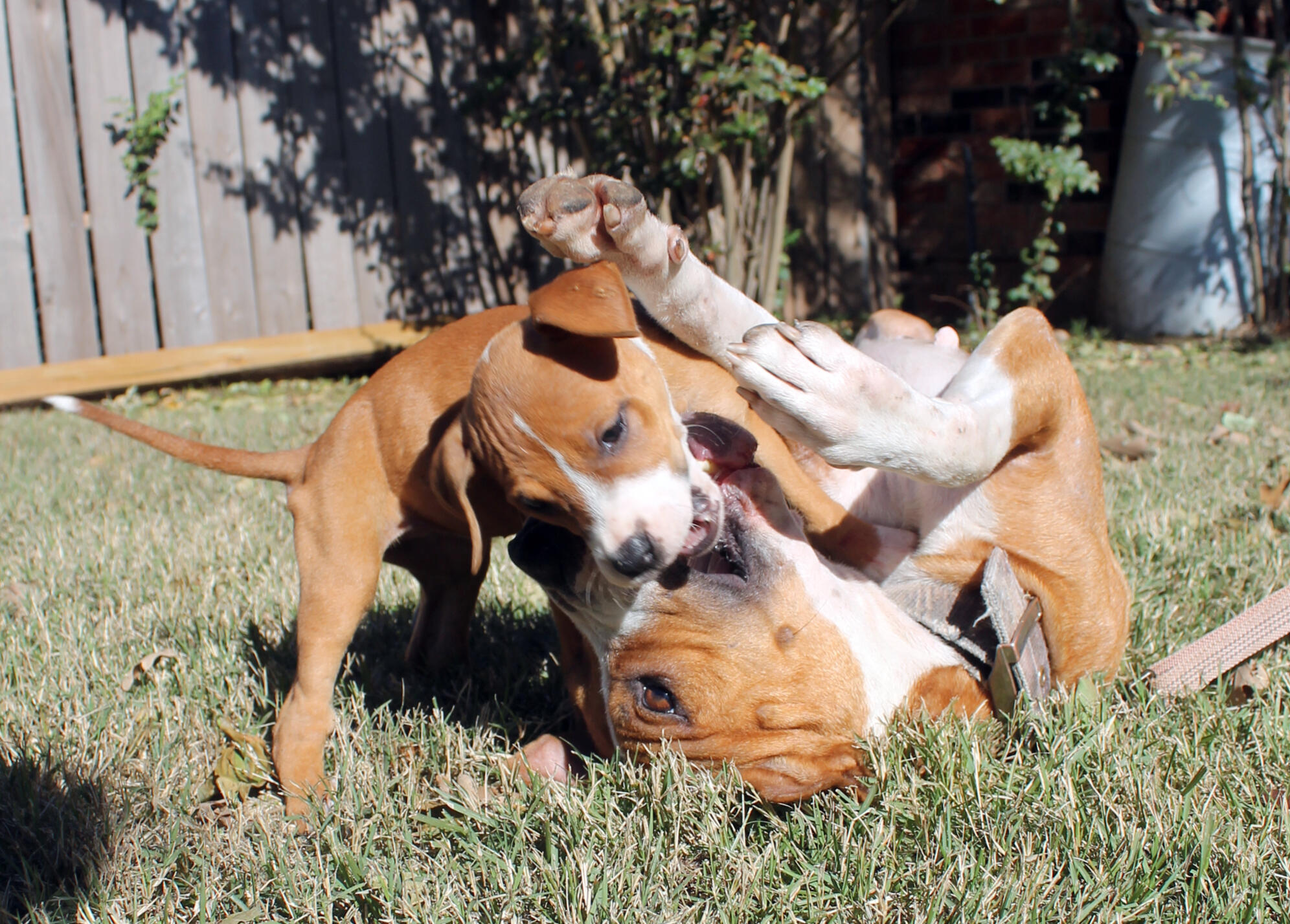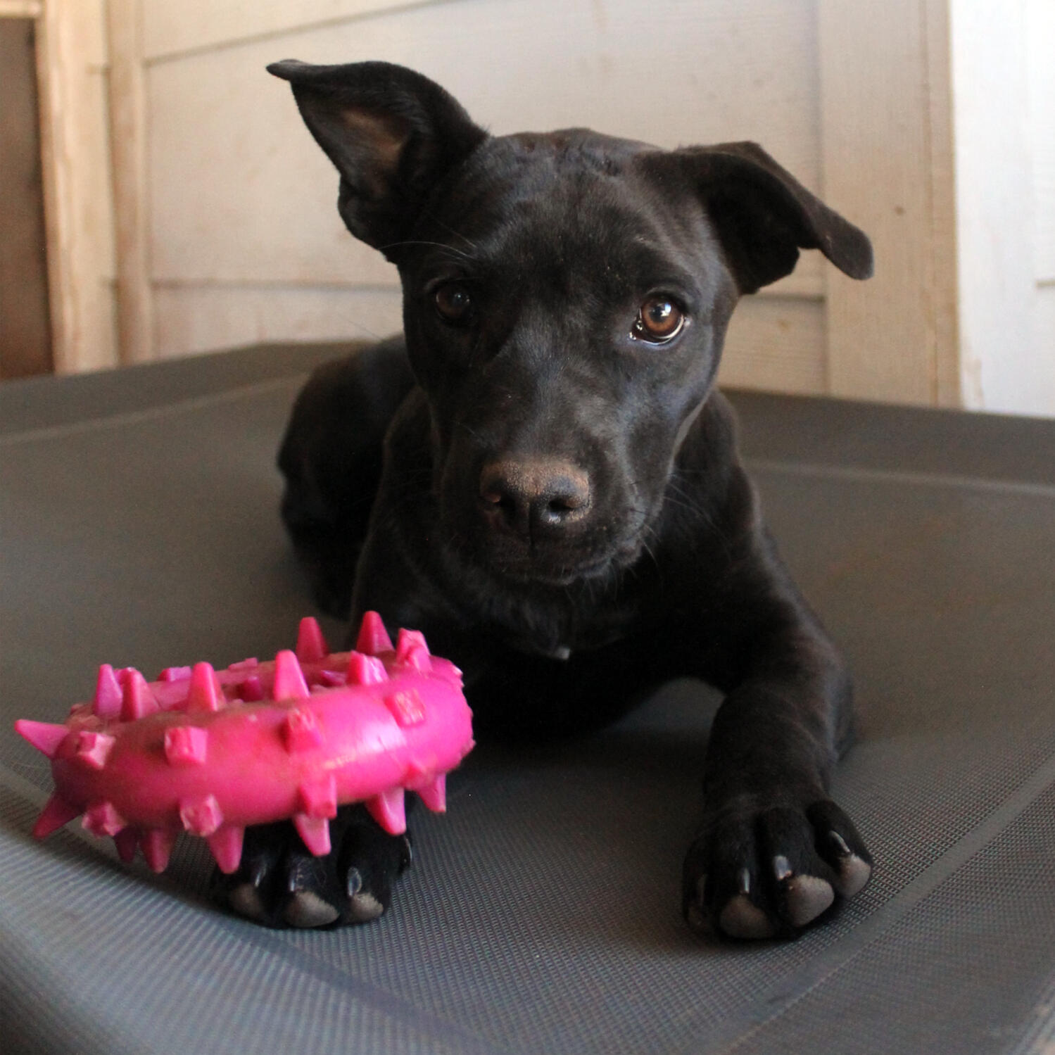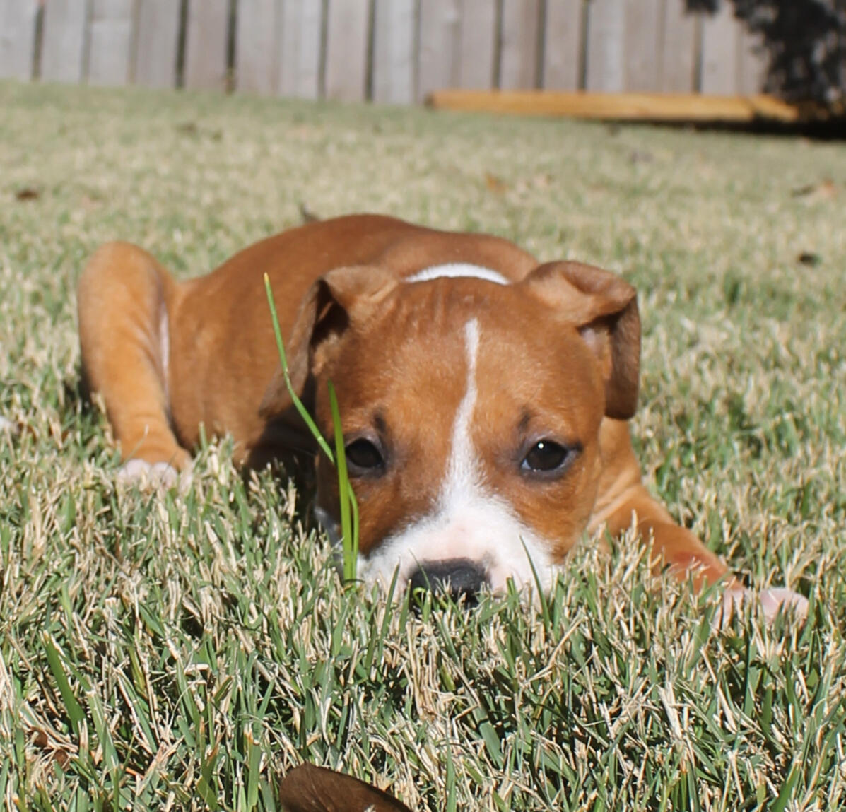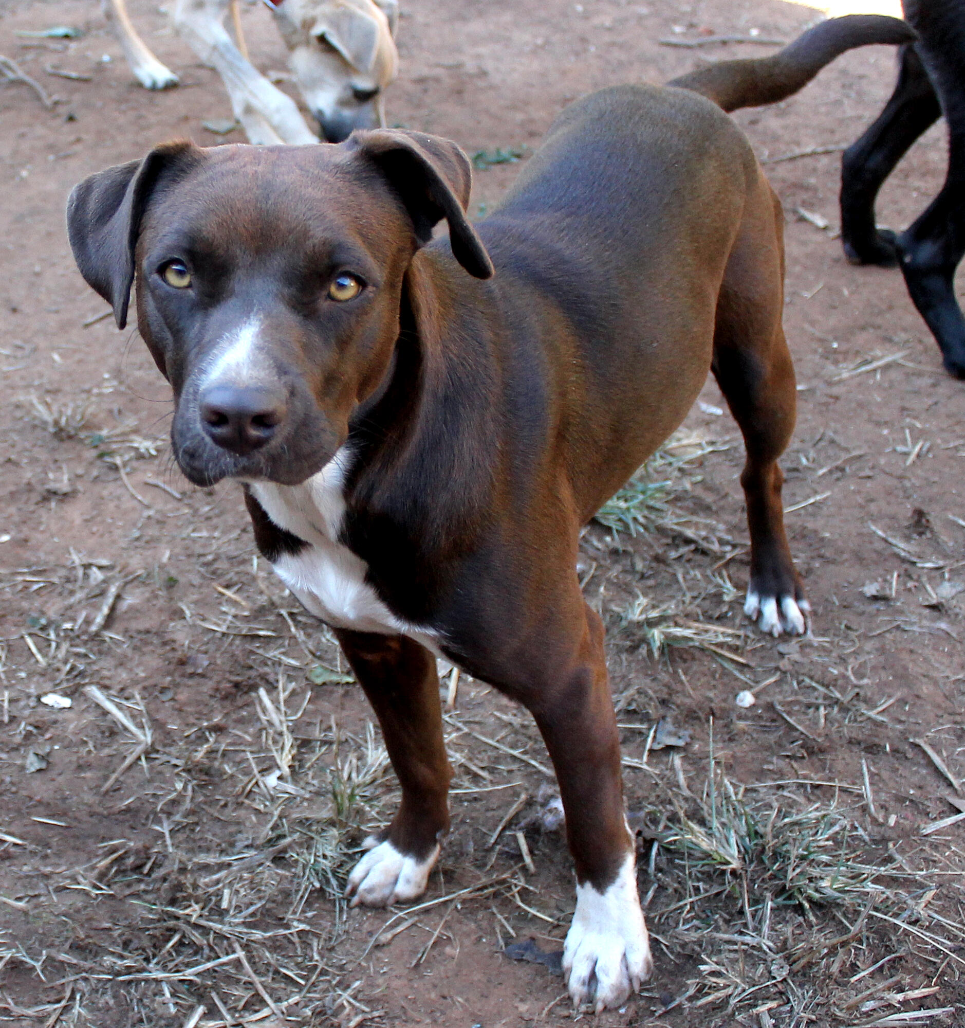 So far we know Cooper is SUPER friendly, and loves to bring visitors his toys to share. He gets along great with female dogs, and hasn't been any trouble with neutered males either. He will make an amazing family dog, and is on the smaller side for a pittie mix.