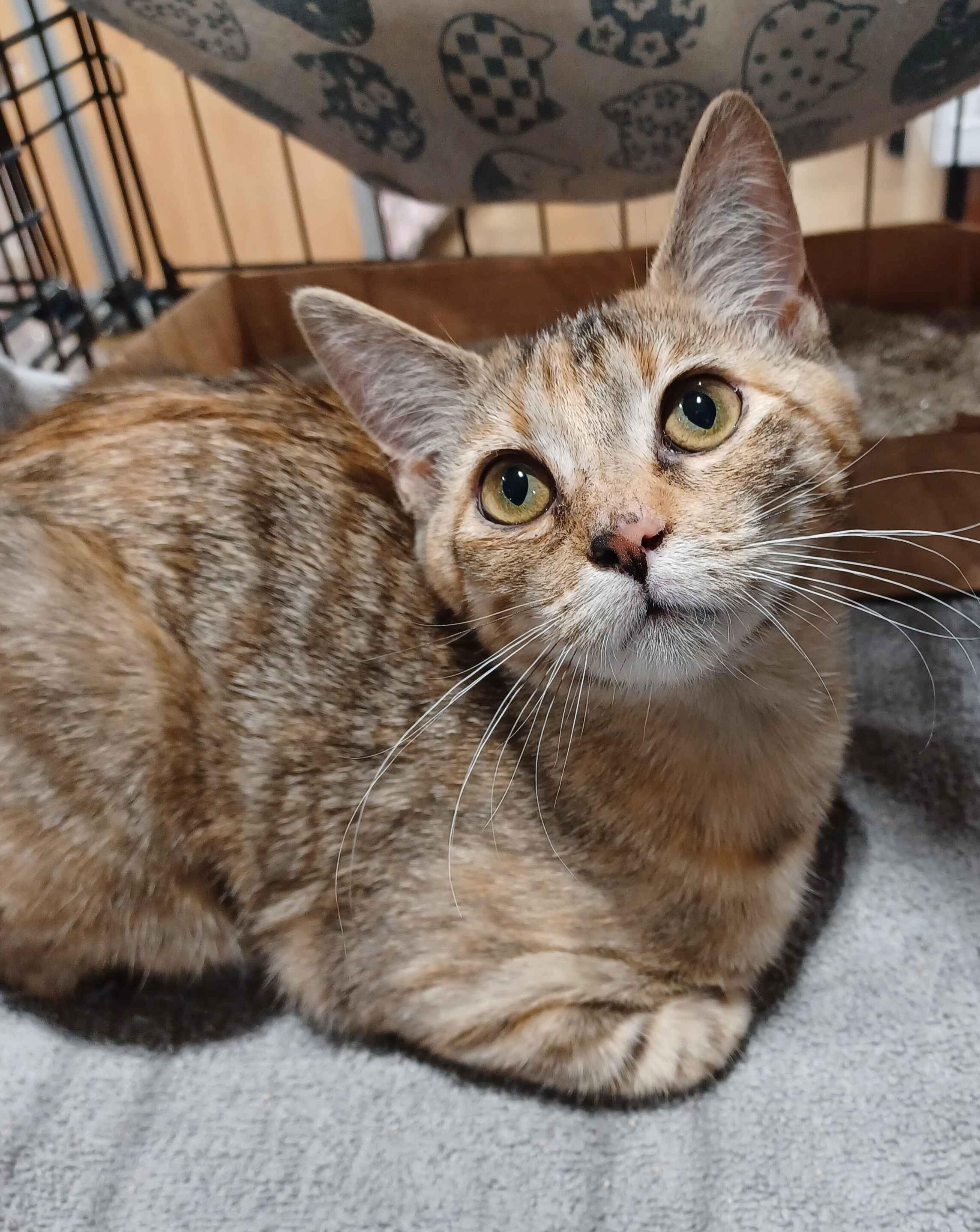 This pretty girl isn't so sure she'd like strangers to cuddle her just yet. She warms up slow, and with a quiet environment. Strangers are new and scary, but once she trusts a person, she'll allow some gentle pets and company. We are hoping she'll learn that strangers aren't so bad with time and lots of treats 🍪🍰 Goldy would LOVE another cat in her home who is much braver and bolder. She needs a feline friend to help boost her confidence.